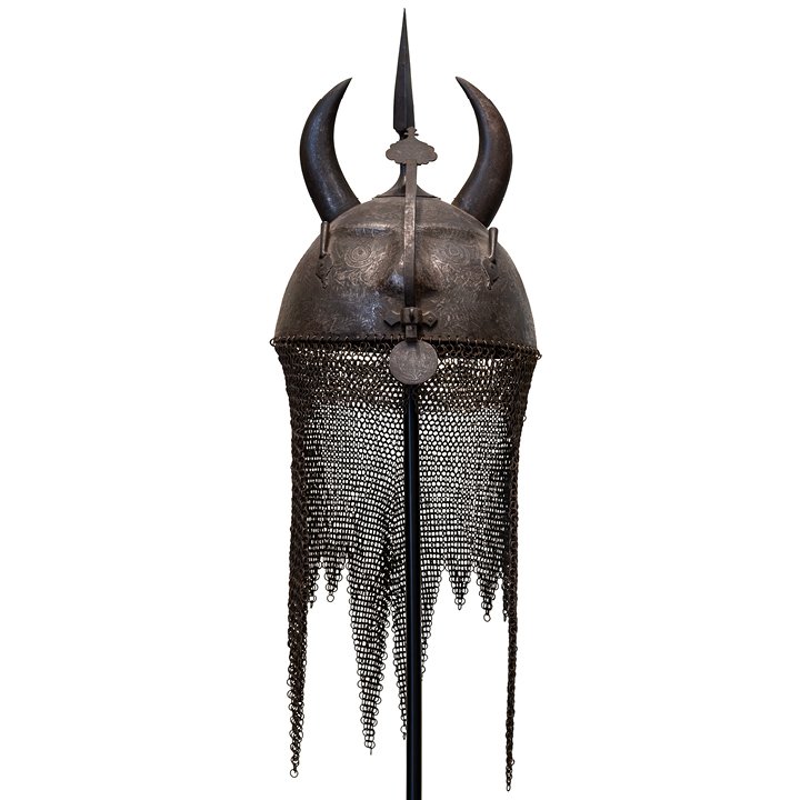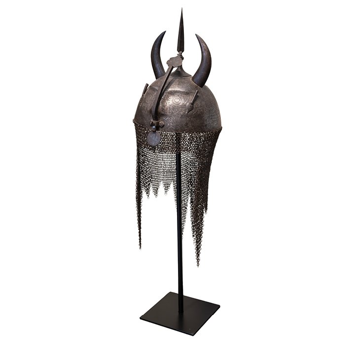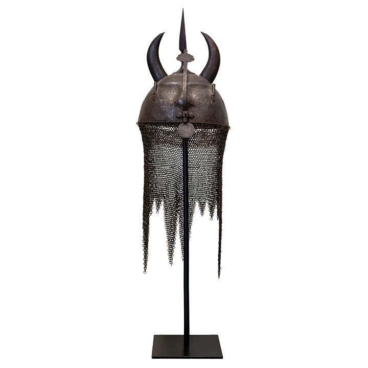 A ceremonial kulah khud helmet from Qajar Iran, formed as the head of a div (demon) with protruding horns and a pointed finial. The steel surface is intricately acid-etched with vegetal scrolls and animal motifs, framing the damascened facial features – eyes, nose, moustache, and fangs – rendered in silver. The helmet is further adorned with two side aigrettes, a nasal guard terminating in a circular disc, and its original camail of riveted steel links.