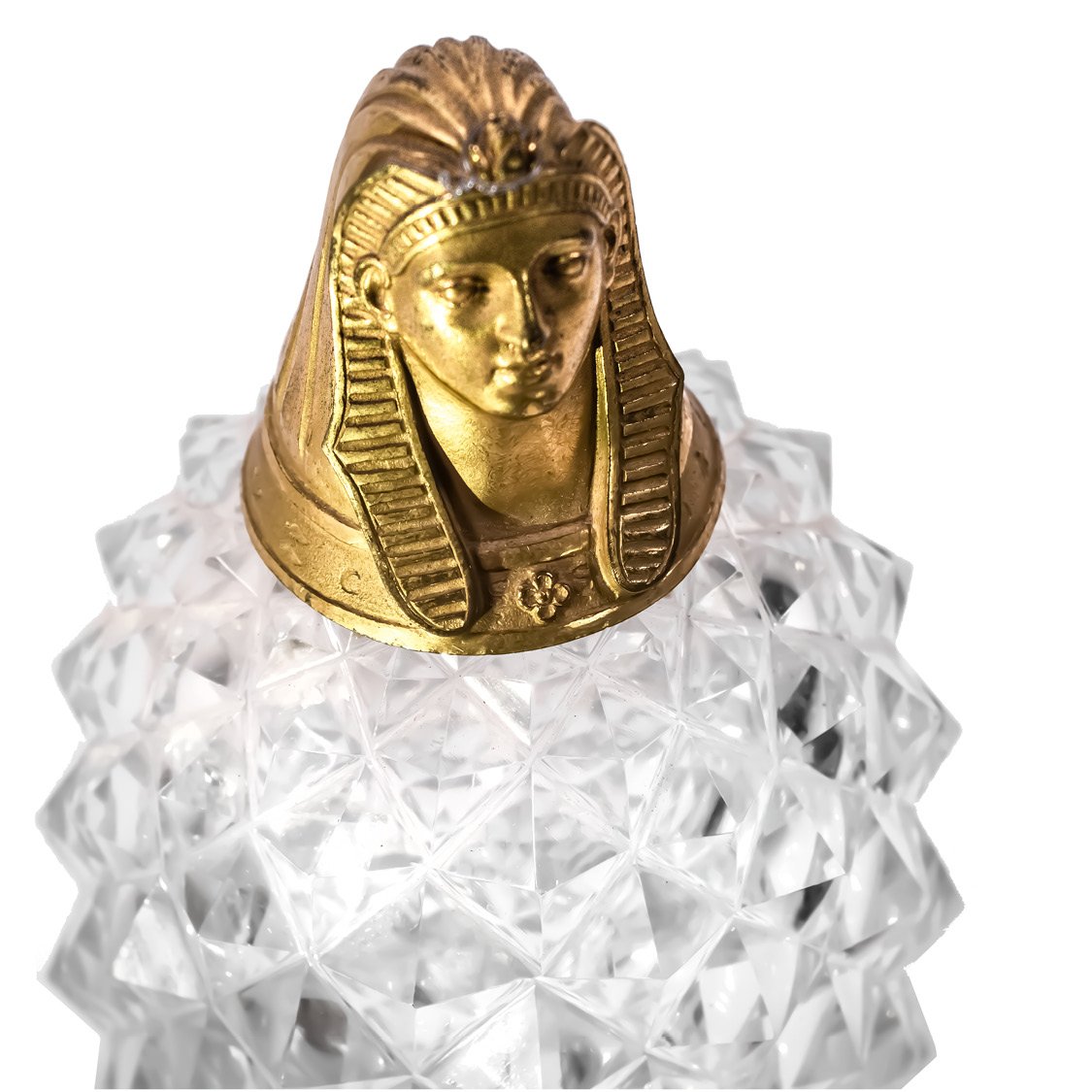 Pair of canopic jars in cut crystal. The body of the bottle is cut in diamond points, resting on a square section pedestal with a star etching. The gilt bronze stoppers are decorated with Sphinx heads wearing nemes. The inside of each stopper has an umbilicus allowing the perfect preservation of the fragrances.