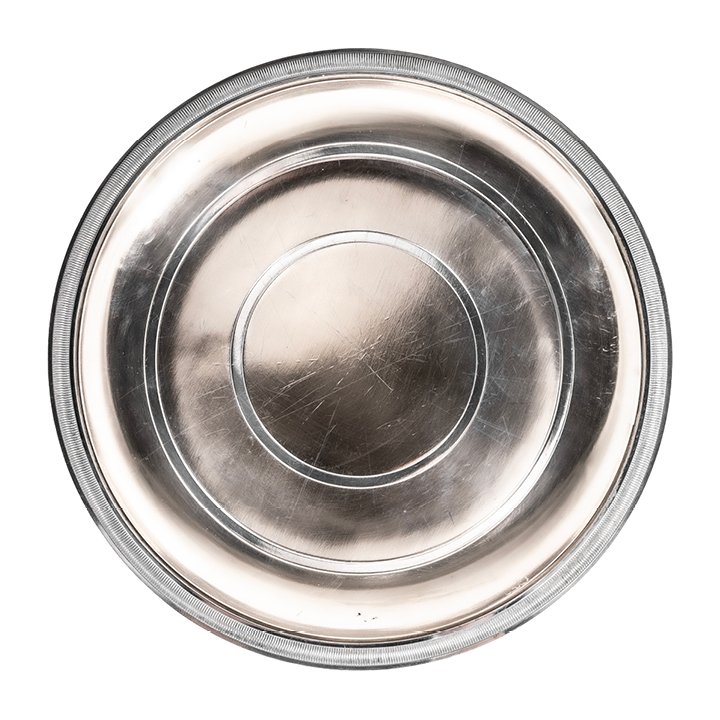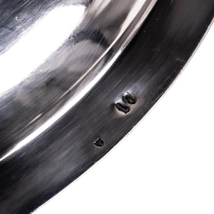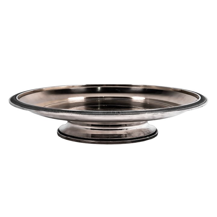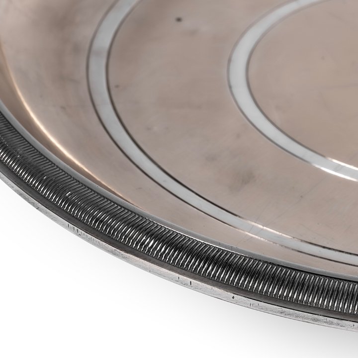 Continental silver-plated serving tazza. The shallow circular dish features a gilt band to the centre and a finely milled border, raised on a spreading circular foot. The rim bears R D stamped marks.