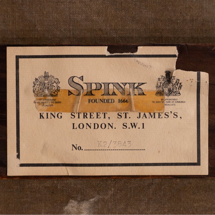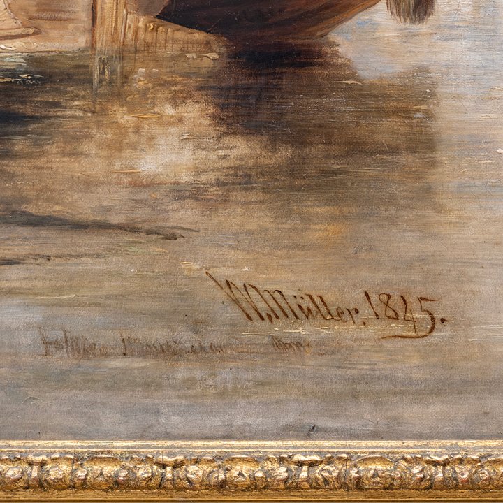 Orientalist oil on canvas painting of substantial scale by British artist William James Muller. The composition presents daily river life on the Nile, with several wooden sailing vessels – feluccas – moored or drifting across calm waters. Signed and dated on the lower right. A label affixed to the verso reads: "With Spink & Son Ltd., London"—a provenance associated with one of Britain's most reputable historic dealers in fine art and antiquities. Mounted in its original giltwood frame, the painting is in excellent condition, recently cleaned and restored, including conservation of the varnish layer.