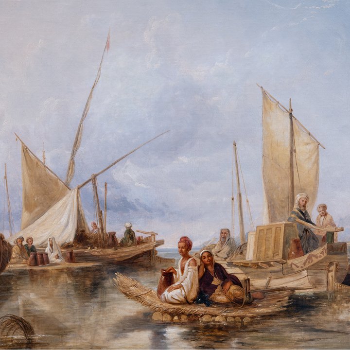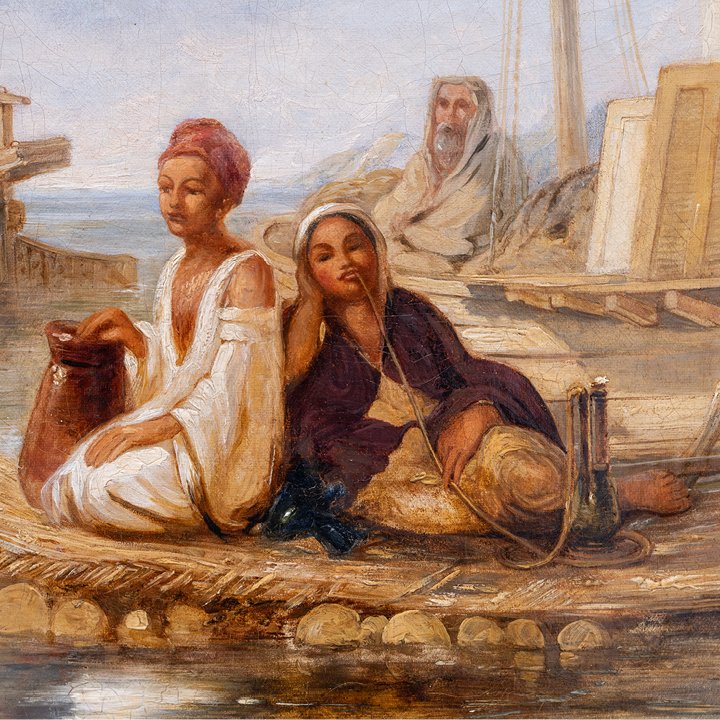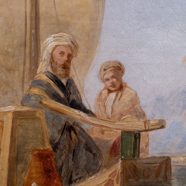 In 1838–1839, Muller travelled to Egypt, where he produced an extensive body of sketches capturing various places along the Nile – from Cairo to Karnak and Luxor. These works became the foundation for his most celebrated Orientalist paintings, noted for their observational accuracy and emotional restraint. In 1843–1844, he joined Sir Charles Fellows on an expedition to Lycia in Asia Minor, further deepening his topographical and architectural interests. Figures on the Nile, painted in 1845, the year of his untimely death at age 33, demonstrates the clarity and maturity of his late style – melding on-site observation with compositional harmony.
