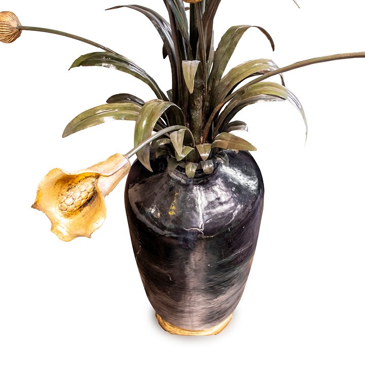Unique tall floor lamp crafted from a vintage-look glazed ceramic vase, featuring a four-feet wood/papier-mache gilt base. The upper section elegantly mimics a bouquet, with metal sheets forming leaves and central flower petals, realistically painted in a dark-green hue. The stems are adorned with gilt papier-mache flowers. Fully electrified and equipped with a type "C" plug. Great condition. Certain metal elements have undergone restoration to enhance their overall integrity.