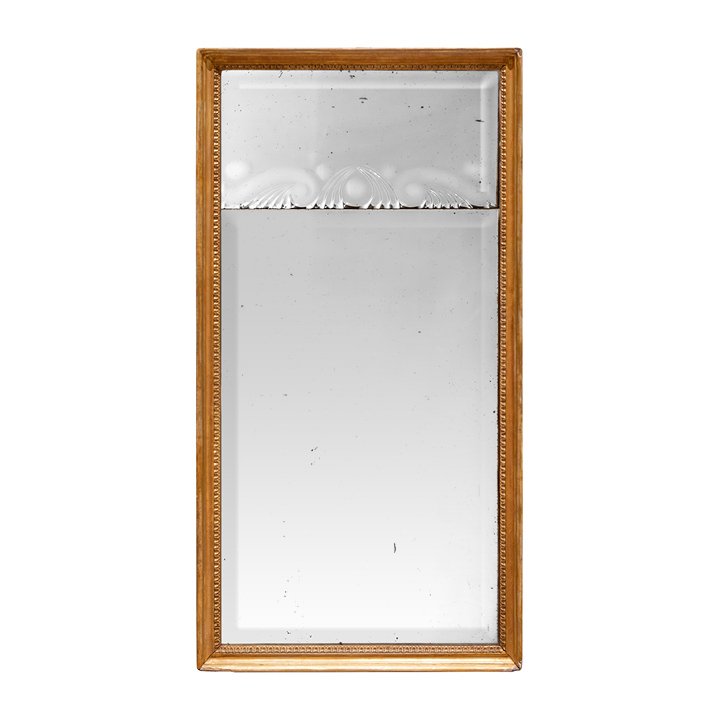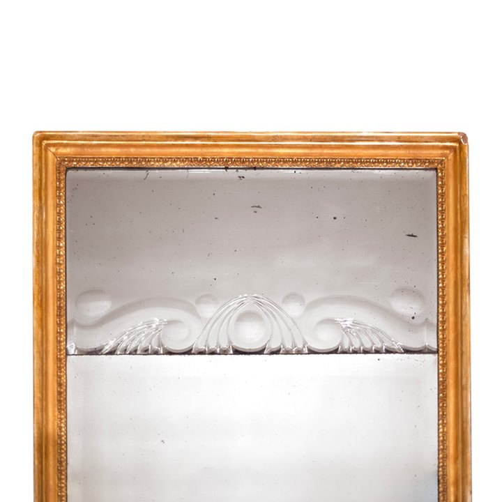 A combination on two bevelled antique mirrors in a later (vintage) giltwood frame. The smaller mirror is decorated with bevelled scrolls and circles. In great condition, minor wear is visible due to natural antique aging. Hanging on the wall with an attached brass ring on the top.