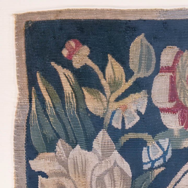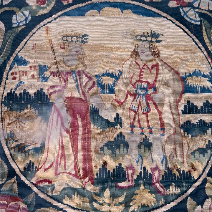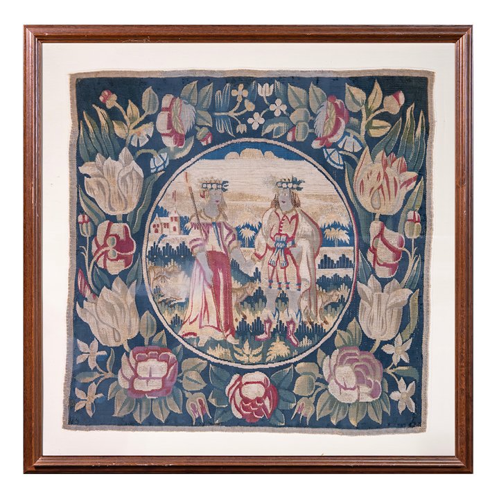 North European tapestry panel woven in wool and silk. The composition centers on two figures wearing floral crowns and standing in a pastoral landscape with sheep, enclosed within a circular medallion. The border is richly decorated with large tulips, roses, and foliage on a blue ground. Later mounted and framed. Preserved in great antique condition.