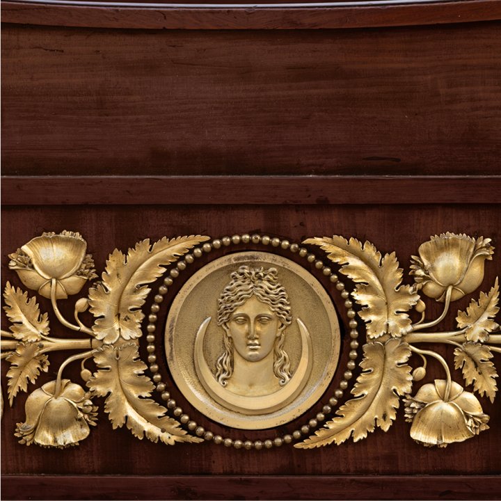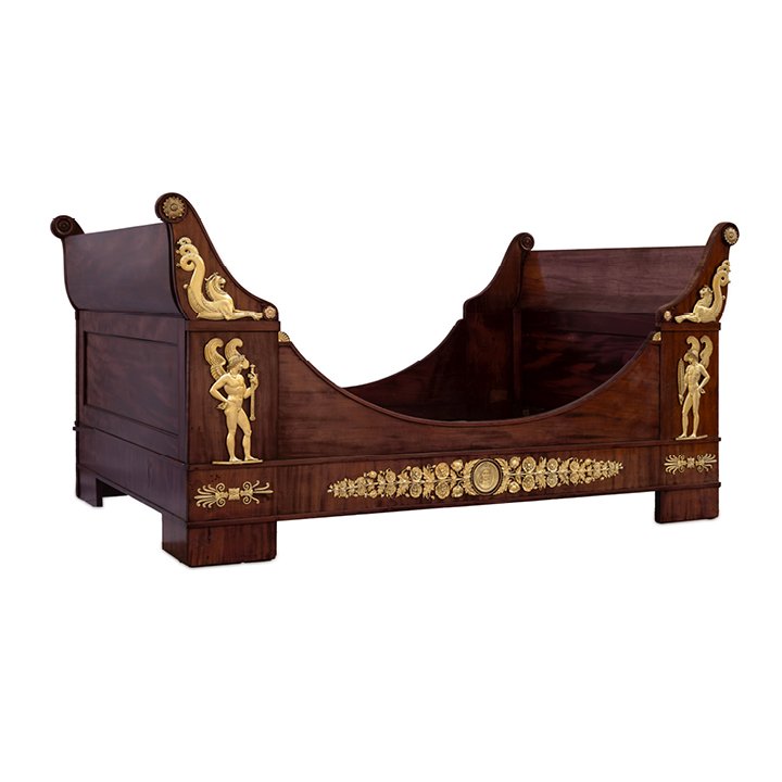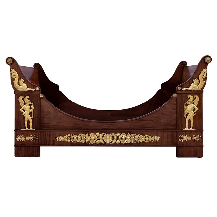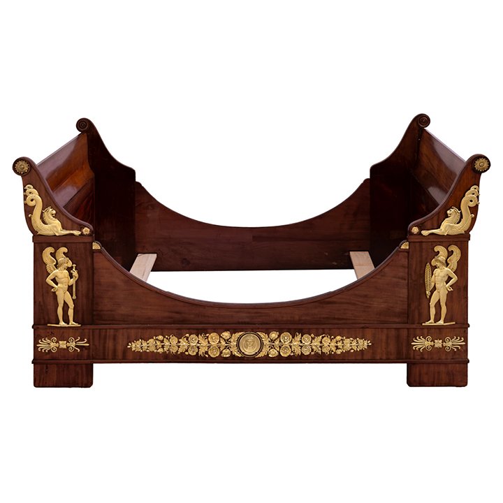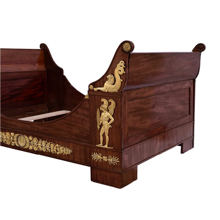 French Empire lit-en-bateau, bed, early 19th century. Sculptural form in rich mahogany with bold ormolu mounts: seahorses and helmeted winged warriors anchor the scrolled ends, while a central gilt frieze radiates around a classical medallion. Originally fitted with turned top rails. Preserved in great antique condition, visible wear on the surface due to natural aging. One of the ormolu mounts is glazed with transparent varnish due to previous restoration. The custom made mattress is included to the set, measuring approximately (but not exactly) a twin size modern bed.