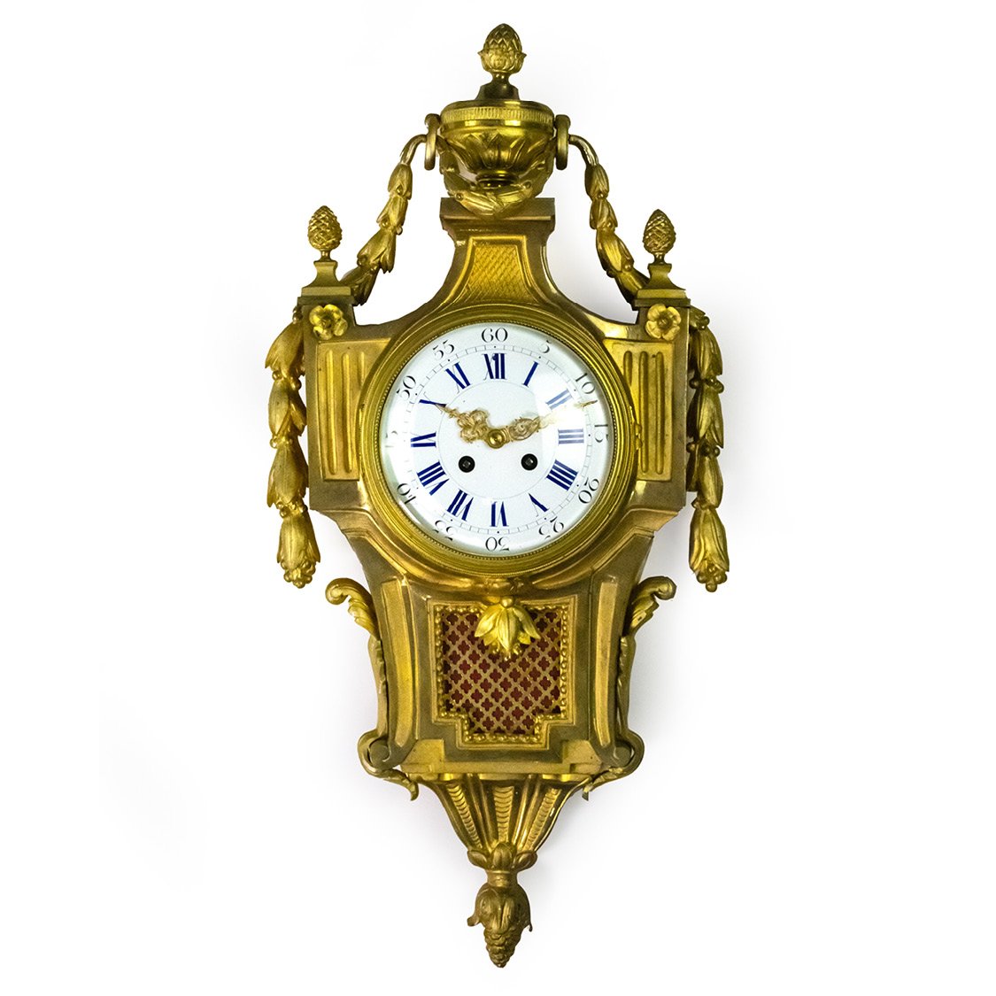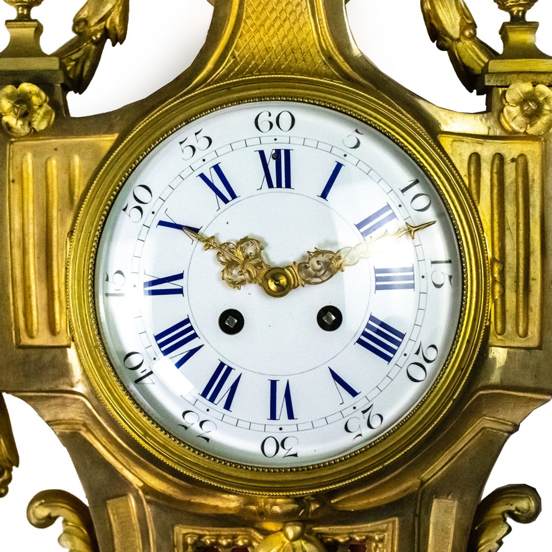 The white enameled dial with Arabic and Roman numbers is topped by a burning vase, with pine cones and laurel leaves garlands. Red friezes ornament between supports.