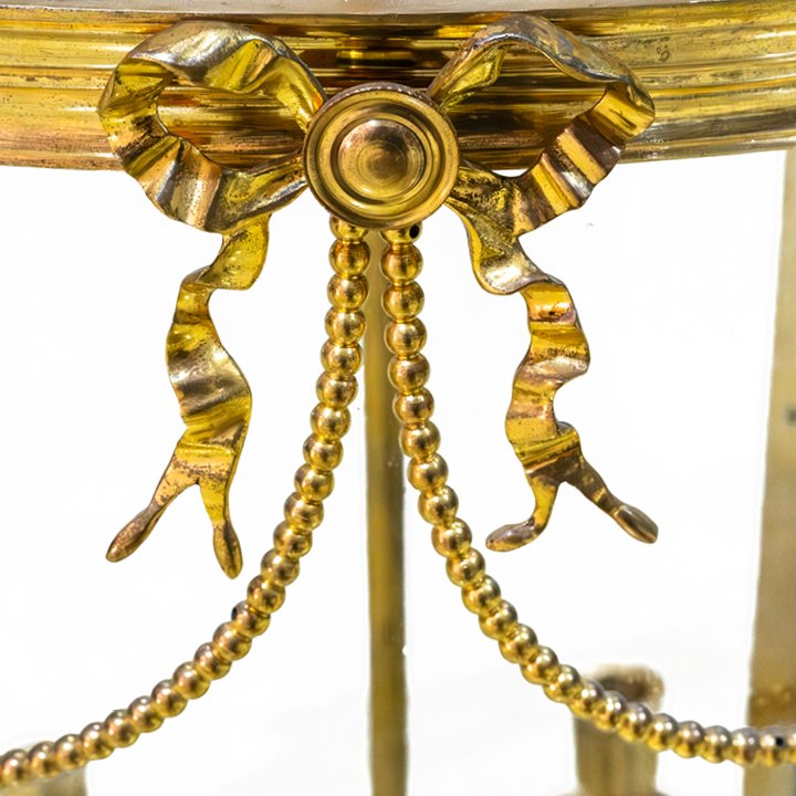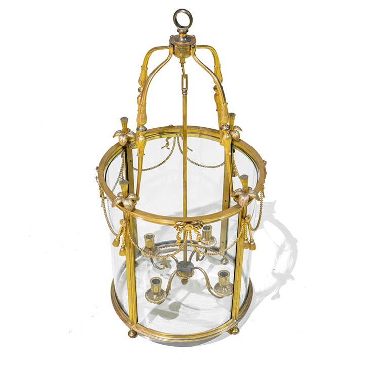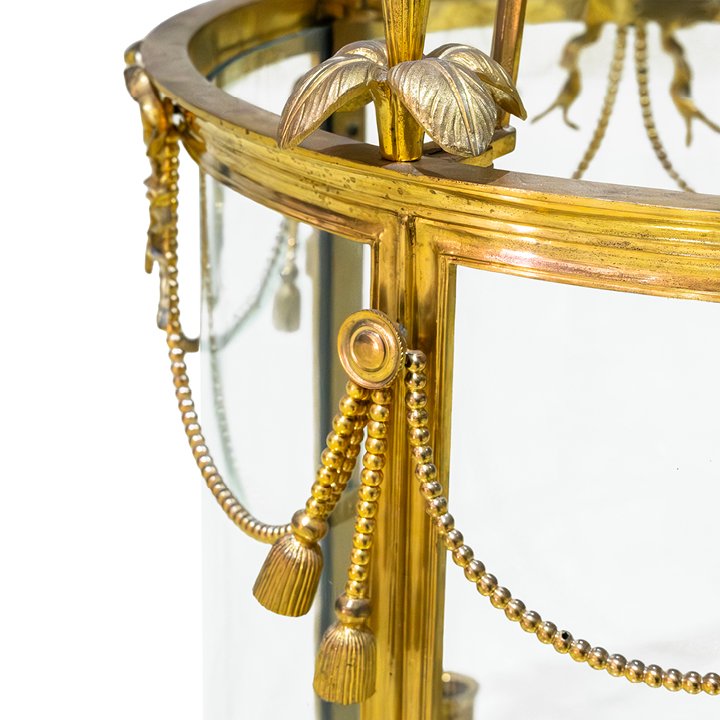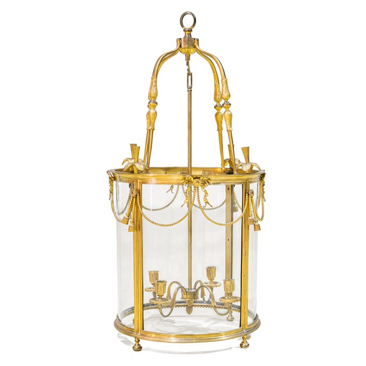 A French Louis XVI-style gilt-bronze hall lantern of cylindrical form, the frame hung with ribbon-tied swags and bead garlands. The central stem issues four scrolling candle arms above a circular base, all enclosed by curved glass panels. Surmounted by a suspension ring with shaped supports, the lantern rests on small gilt-bronze feet.