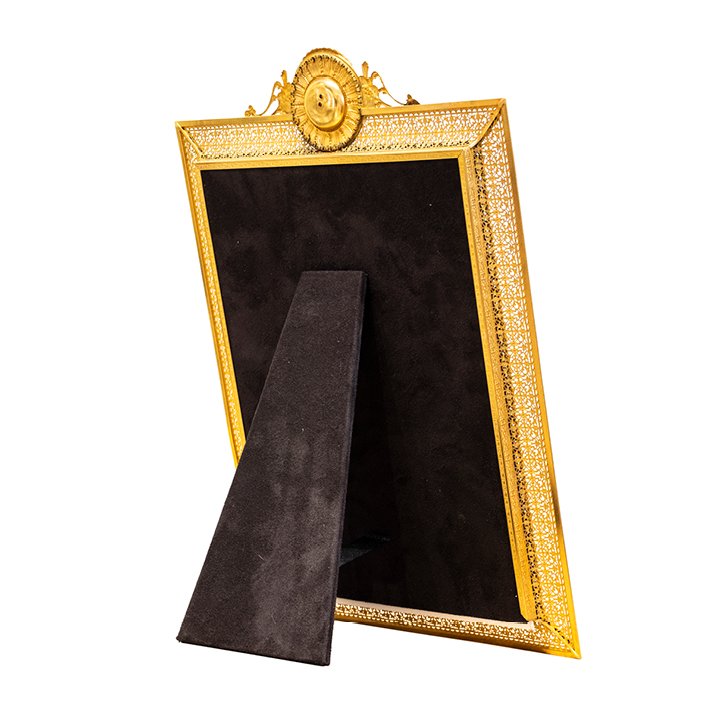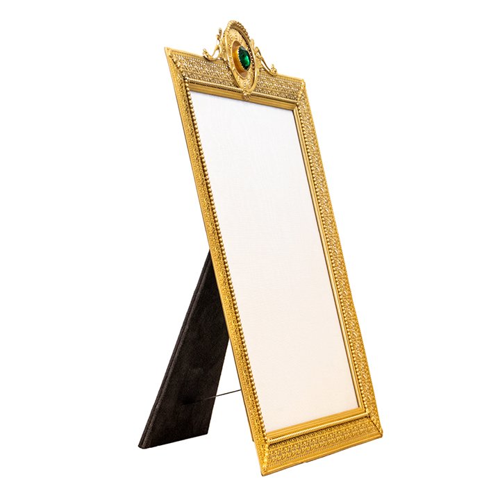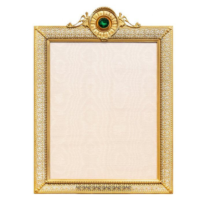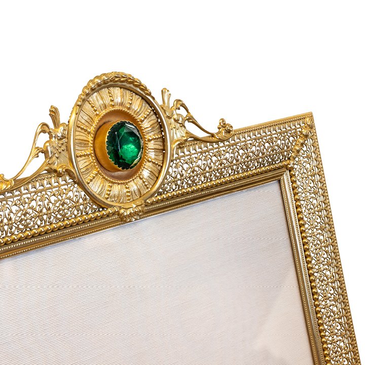 Chiseled and filigree gilded photo frame and embellished with an emerald color crystal mounted in the center of the top of the frame.