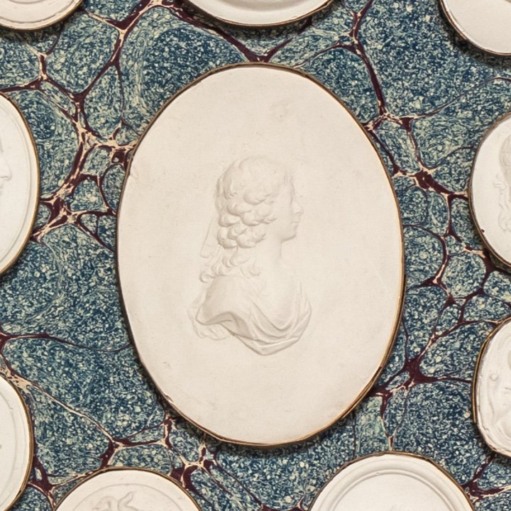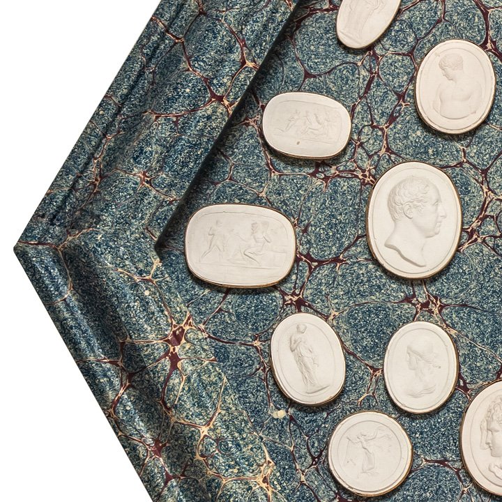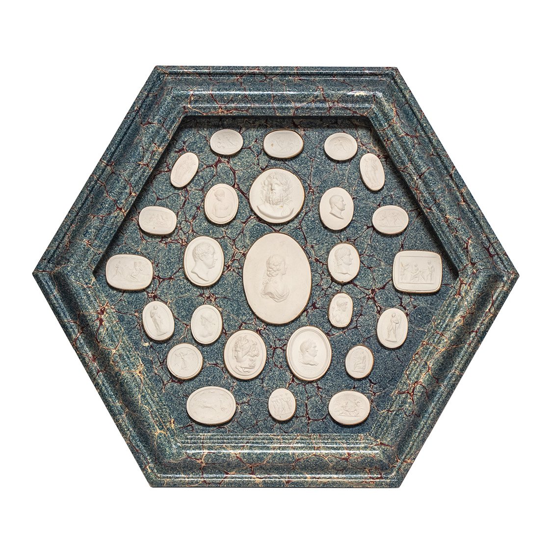 Set of plaster intaglios framed under glass in a hexagonal frame covered with blue-and-brown marbled ‘Spanish wave’ paper. Each oval cameo is surmounted in brass and depicts Greco-Roman personalities and mythological scenes.