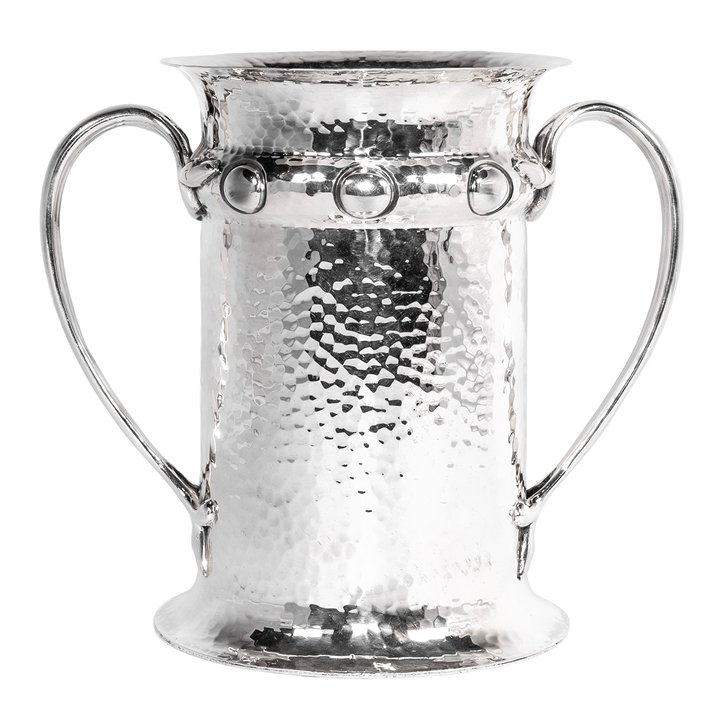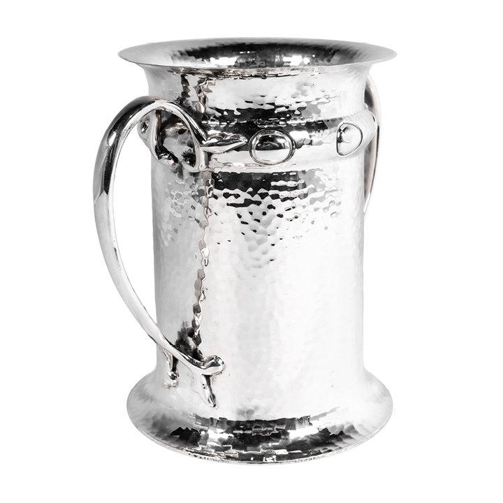 Silver plated drink cooler with a hammered surface and twin loop handles. The cylindrical body is decorated with an applied band of raised roundels below the flared rim. The underside carries stamped marks.