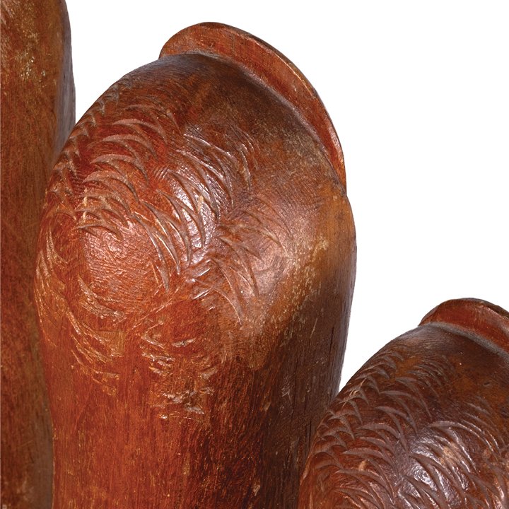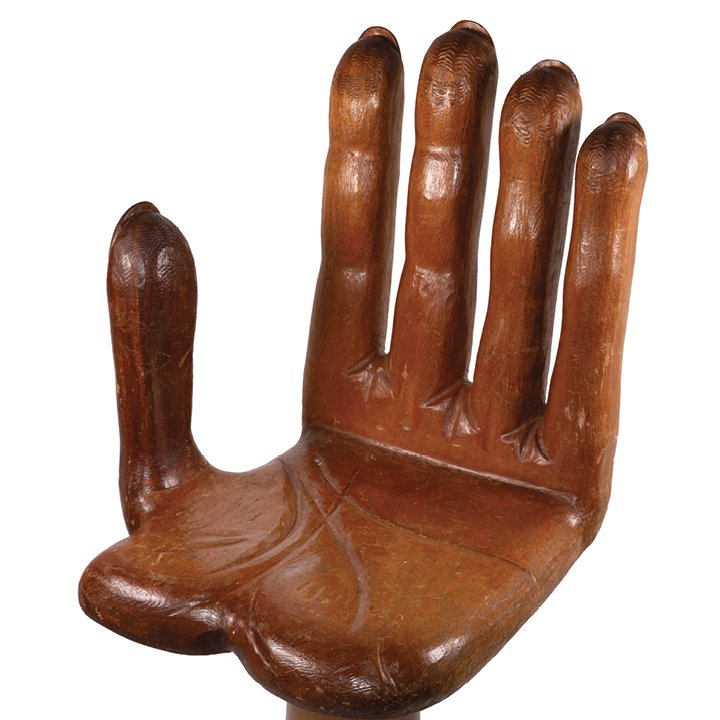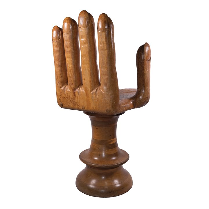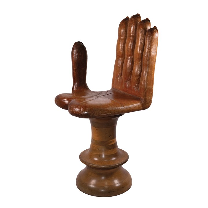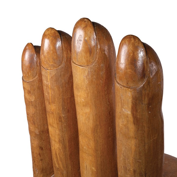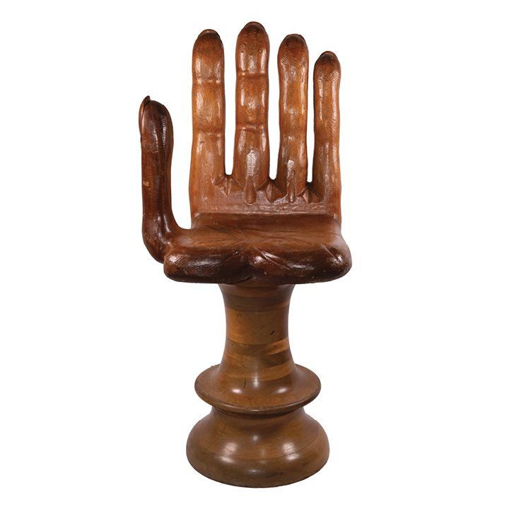 A sculptural swivel chair formed as an open hand, carved and turned from solid hardwood. The palm serves as the seat, with the upright fingers forming the backrest, raised on a turned pedestal base. The chair combines functional design with striking Pop and Surrealist influences of the Mid-20th Century. In great vintage condition, minor wear on the surface due to natural aging.