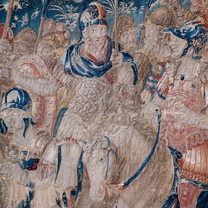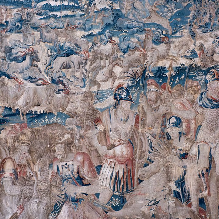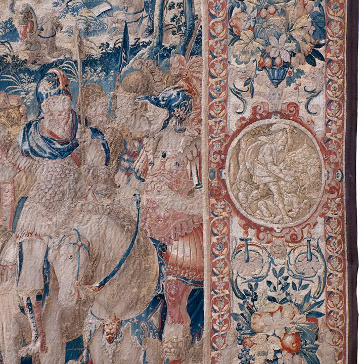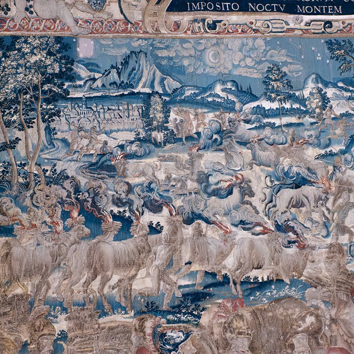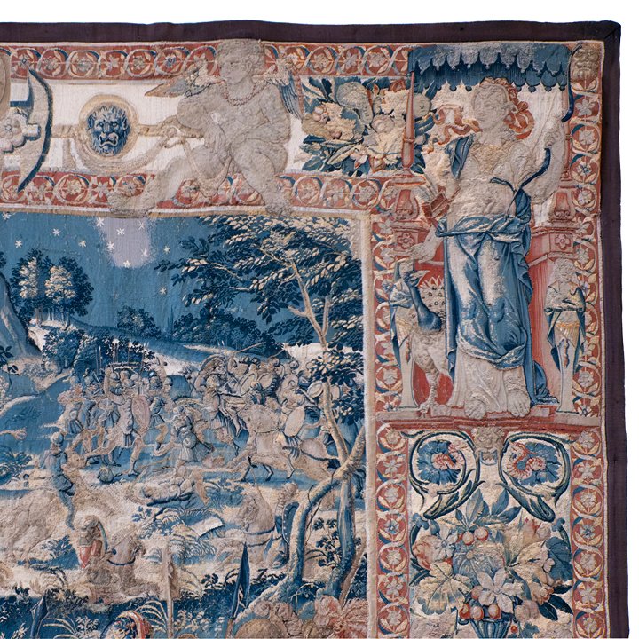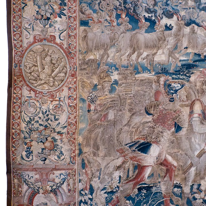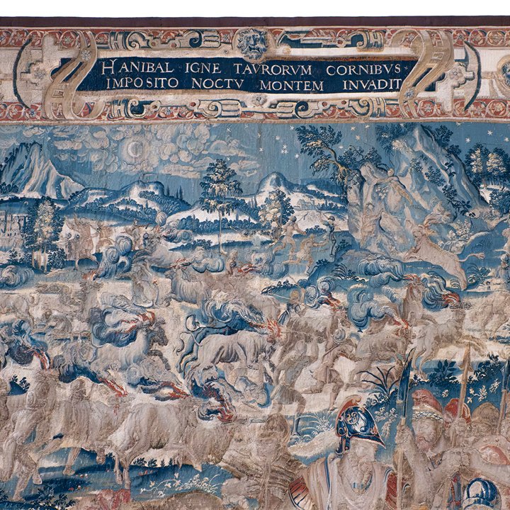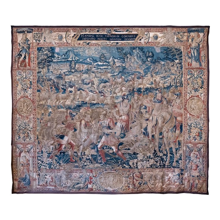 Exceptional large Flemish historical tapestry, attributed to Brussel tapestry studio, Belgium. The composition illustrates one of the most famous tactical maneuvers of the Carthaginian general Hannibal Barca – his ingenious use of flaming-horned cattle to deceive the Romans during the Battle of Ager Falernus in 217 BC. Notable inscription in Latin states: “Hanibal Igne Taurorum Cornibus Imposito Noctu Montem Invadit.” The border is adorned with distinctive floral and fruit garlands, cameos of military and mythological figures, including Apollo, Artemis, and others. Preserved in good antique condition, restored – patch inserts, reinforcements, new lining and borders. Visible signs of aging – color fading, some thread pulling and loosened sections, but overall no structural damages.