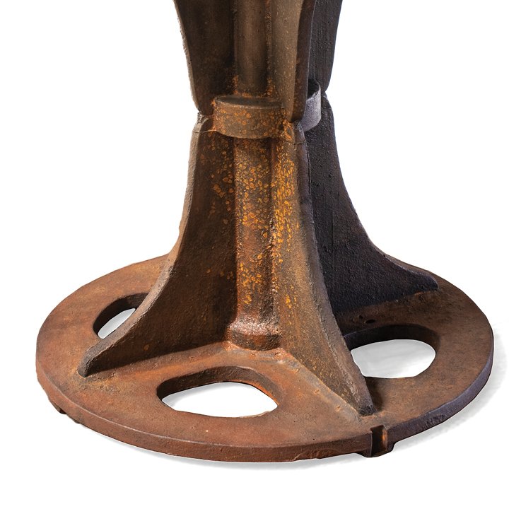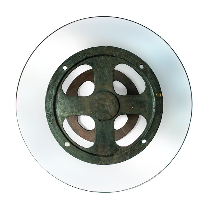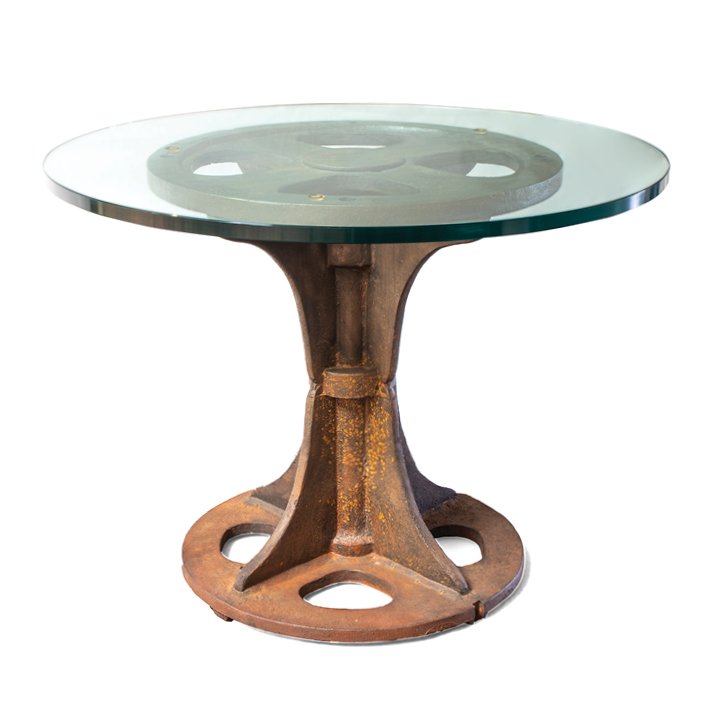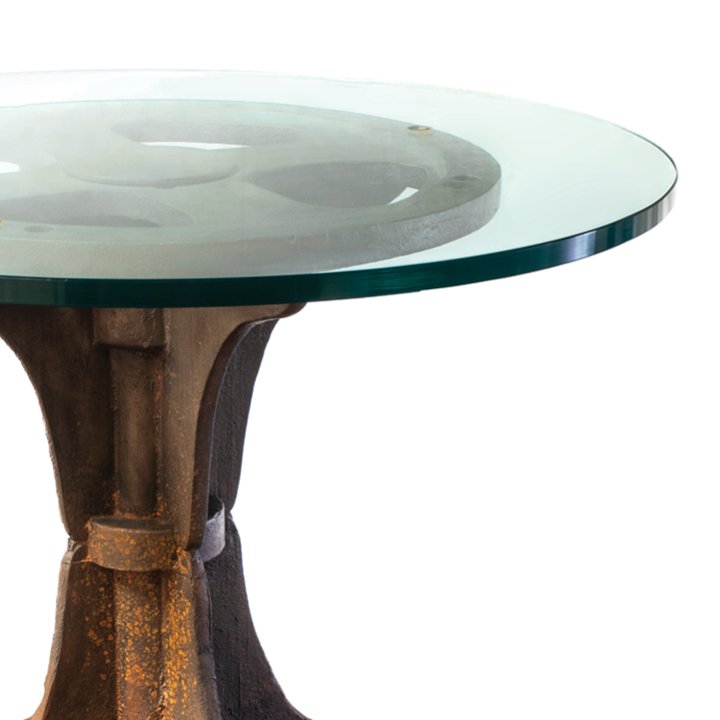 Round side table with a cast iron antique gear base. Completed with a new tempered glass table top. The base shows rust on the surface due to natural aging.