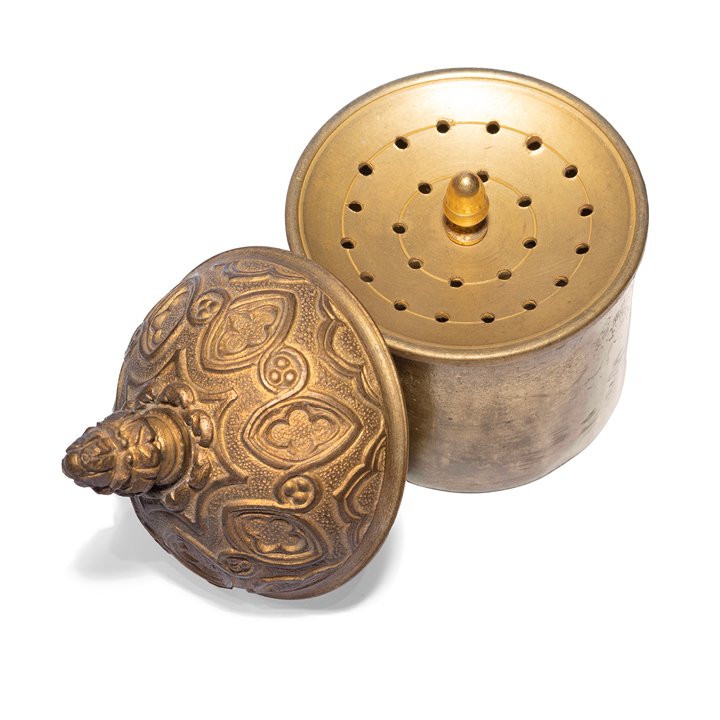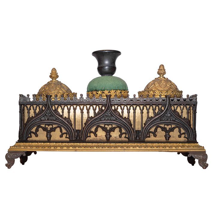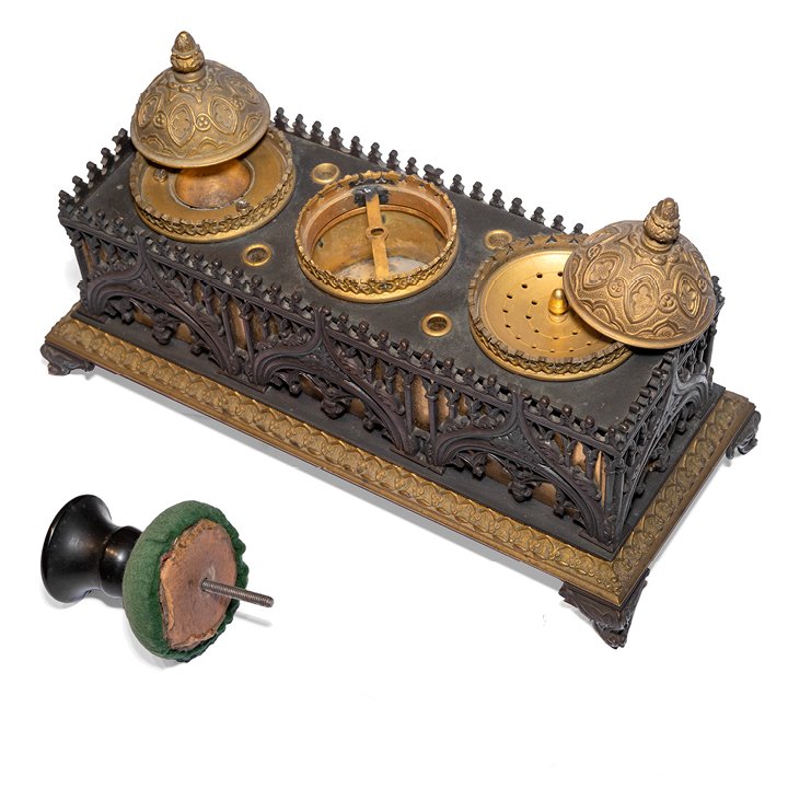 French stationary set in Gothic Revival style, with parts in patinated and gilt bronze. Contains original ink pot and a pounce pot, both covered by dome-shaped lids, and a central wafer box with taperstick holder. Preserved in great antique condition.