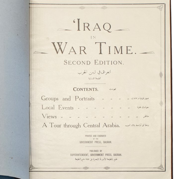 Remarkable photographic record, a photo book printed in Iraq. Though the author is not stated on the title page, the photographs are attributed to the renowned British explorer Harry St John Philby, who journeyed through Iraq and Saudi Arabia in 1917, capturing thousands of images.