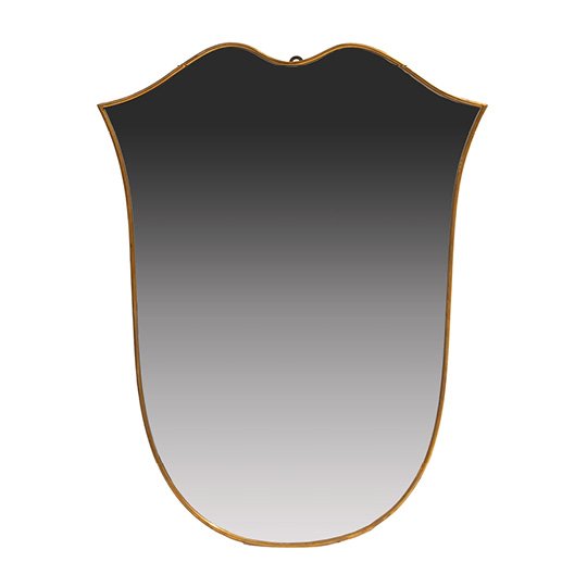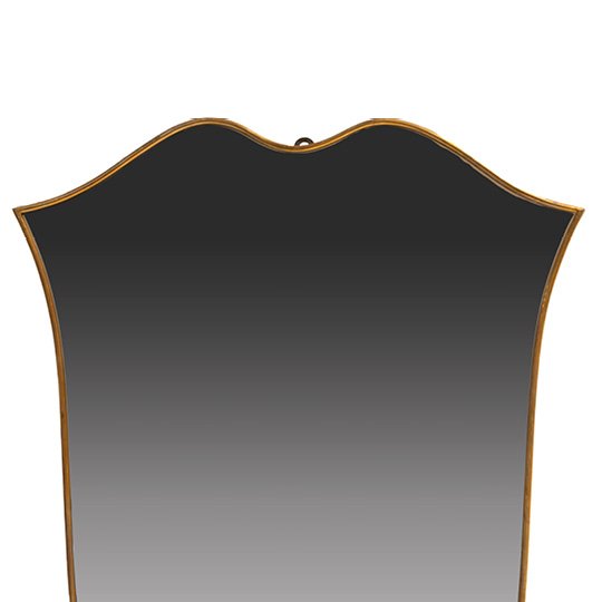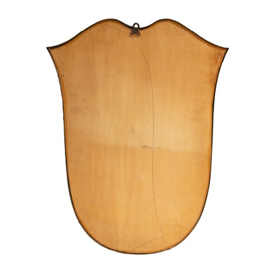 Elegant medium sized wall mirror in style of Gio Ponti. The curved brass rims resemble a shape of a shield and hold the mirror on the panel with brass nails. The wall hook is attached at the verso.