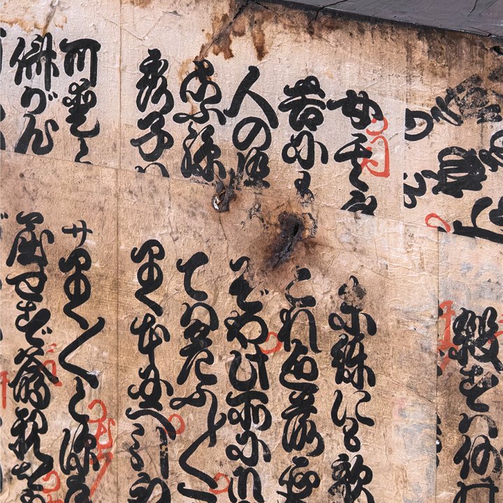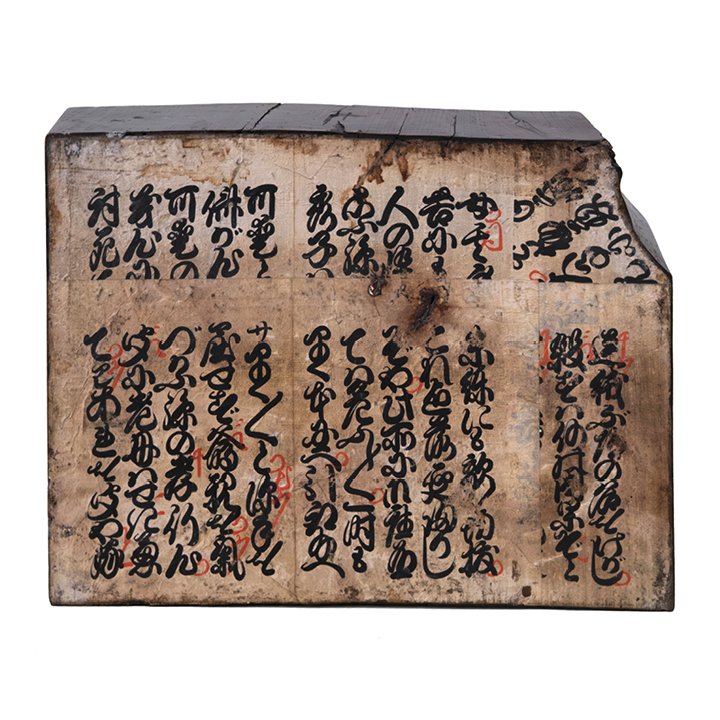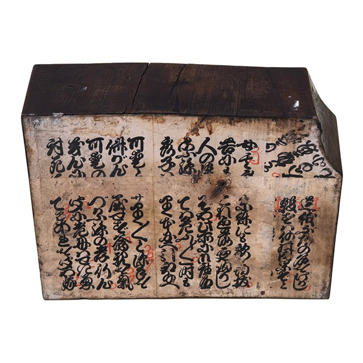 Keyaki wood plinth with hand-painted Japanese calligraphy. The surface is inscribed in black ink with red annotations written in kuzushiji, the historical Japanese script used for Buddhist texts and chanting practice. The vertical composition follows the format of devotional boards displayed in temple interiors. The wood shows natural grain and patina from age and use.