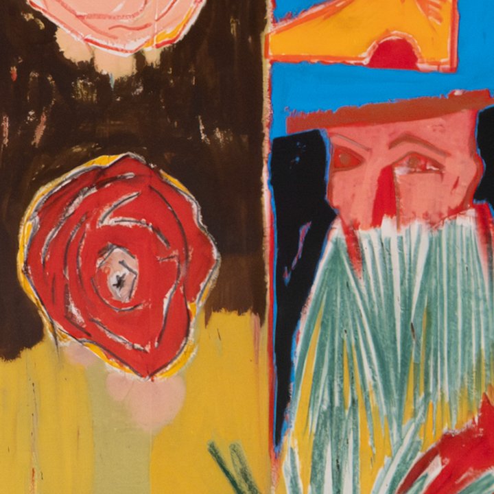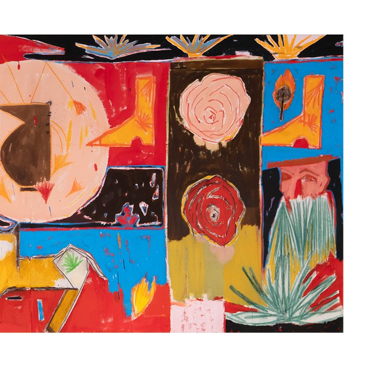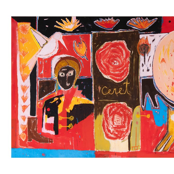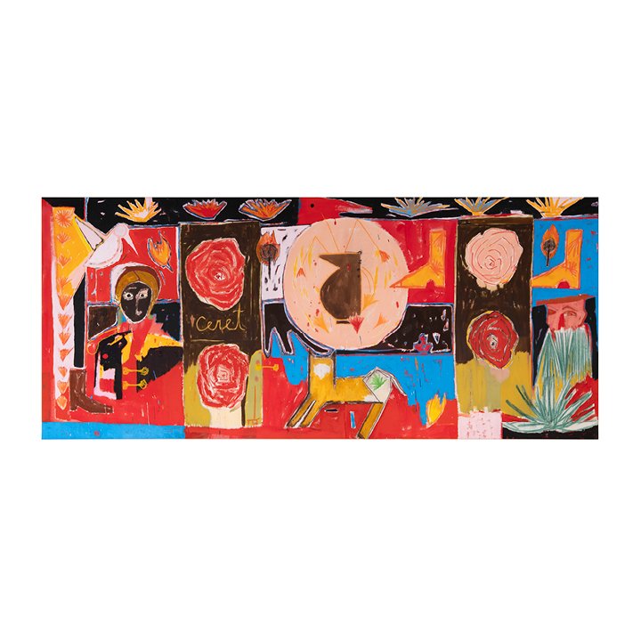 This vibrant, large-scale piece by Iranian-born artist Farshad Farzankia, Combining abstract forms, vivid primary colors, and symbolic imagery, the composition reflects themes of identity, memory, cinematography, and modern culture. The central figure and abstract motifs recall the tension between tradition and modernity, a recurrent subject in Farzankia’s work.