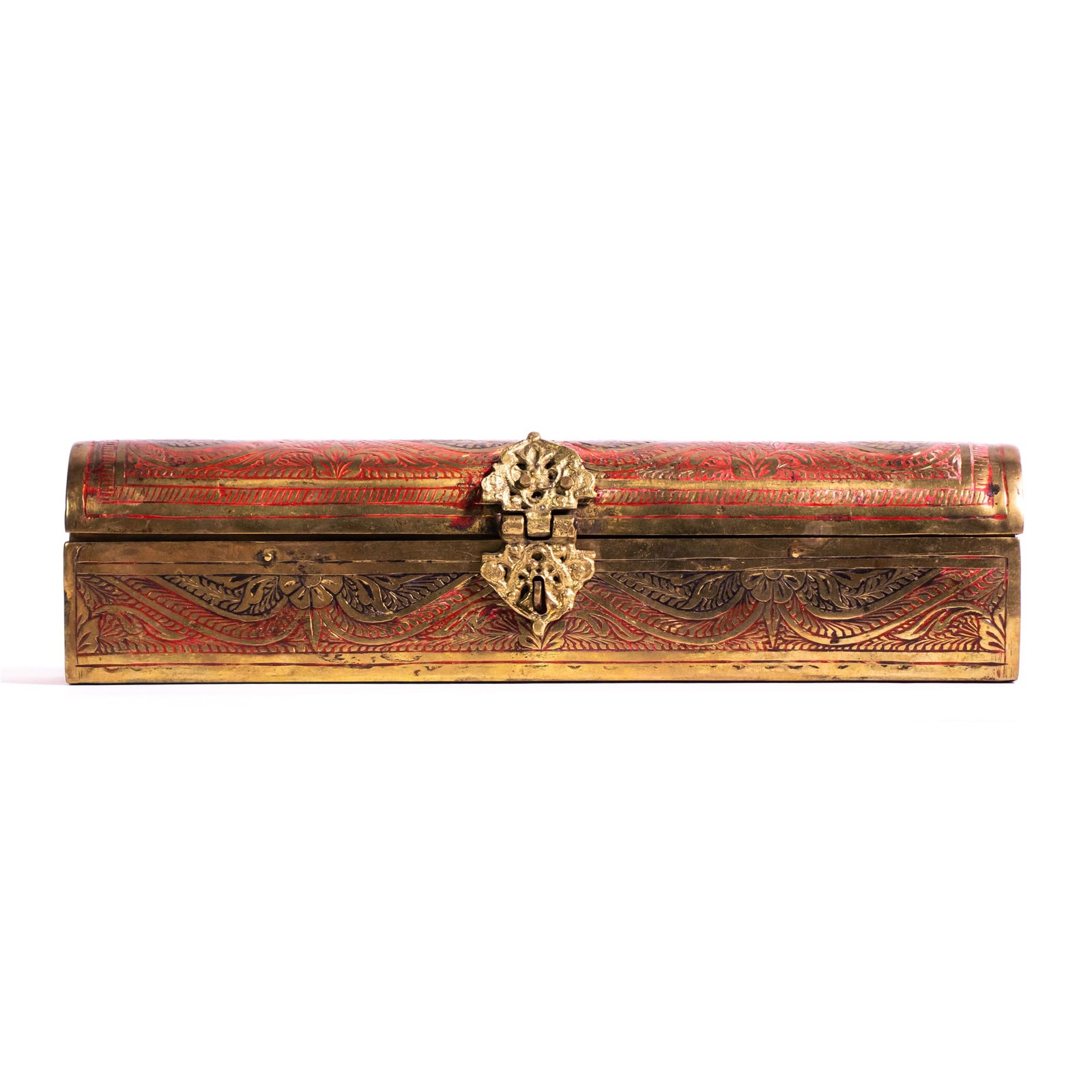 Large Pencase in brass finely inlaid with floral motifs: re-upholstered internally in green woolen cloth; attractive closing hook.