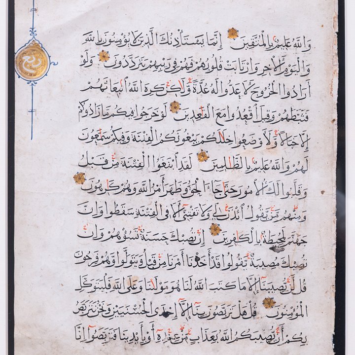 Qur’an folio containing verses 9:44–52, Ilkhanid or Mamluk period, Iran or Egypt, 14th–15th century. Arabic manuscript on paper, written in black thuluth script in 13 lines per page. Gold rosette verse markers throughout, with red diacritical marks and a teardrop-shaped rub? marker in gold and blue in the margin.