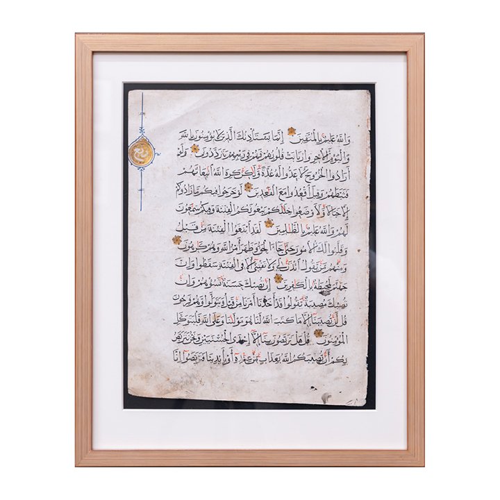 Mounted in a cream mount and newly framed under museum glass. The folio shows expected age-related wear, with clear script and intact decorative elements.