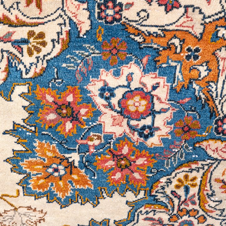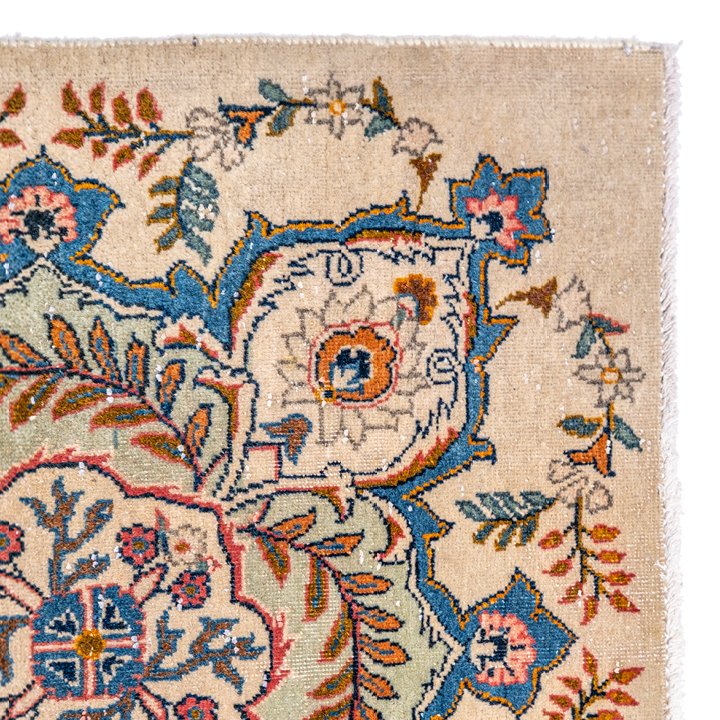 Fine, high knot density, short-pile wool Kashan carpet with traditional Persian design. Intricately detailed polychrome composition with a large central medallion surrounded by a delicate scroll border. Wonderful combination of colors, predominantly ivory, blue, pink, and orange. The selvages and short fringe seem to have been redone. Great condition for an antique piece, with localized wear on the pile.
