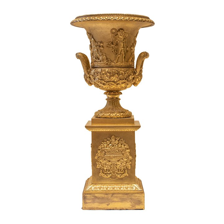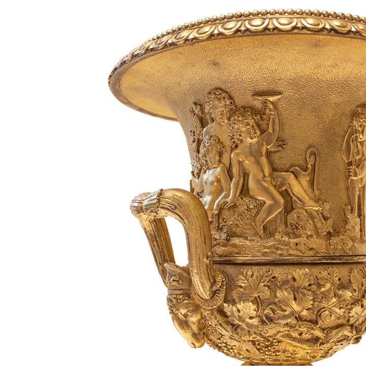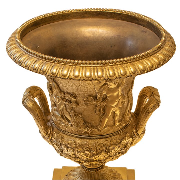 Large gilt bronze "Medici" centerpiece in Late Empire style with Bacchanalian procession of classical figures. Handles are decorated with ram heads, and the bottom part is completed with wine foliage. The square stepped base is mounted with a triumph decorative bas reliefs and adorned with classical acanthus plinth.