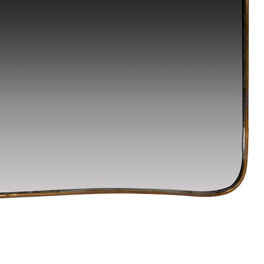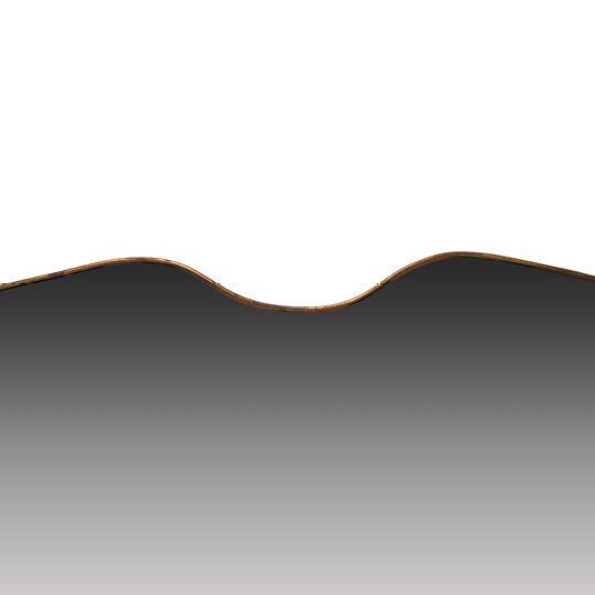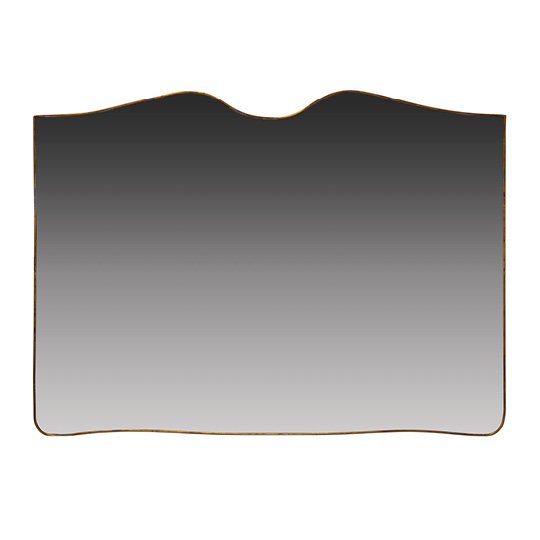A large vintage mirror with a wavy bottom and a curve shaped top. The brass frame displays natural patina in some areas.