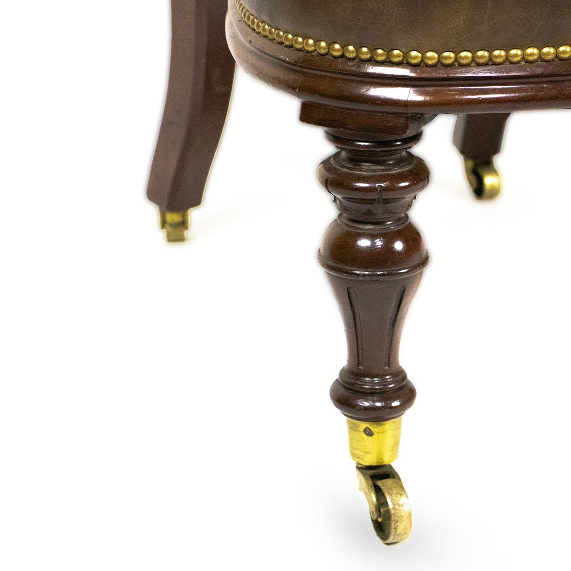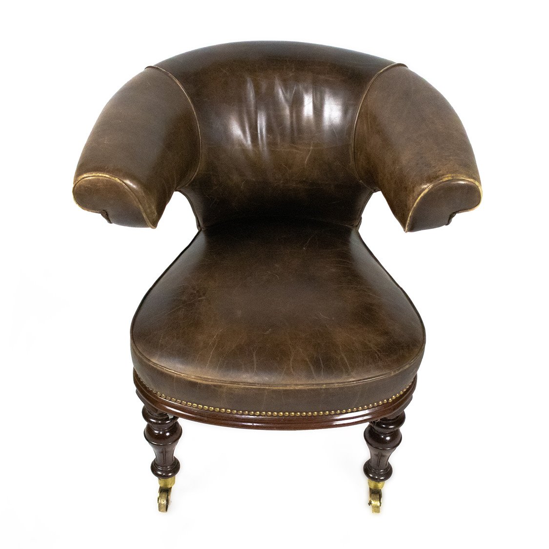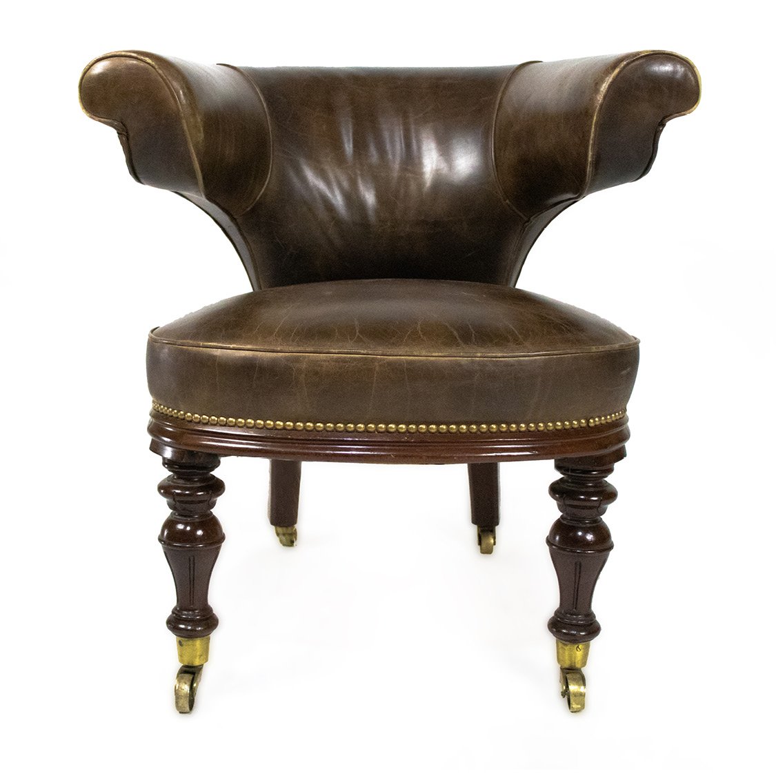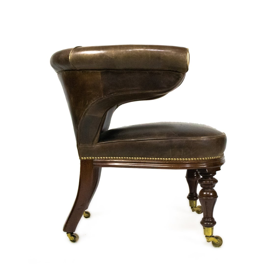 A Victorian office armchair, made in the second half of 19th century England. It is upholstered in dark brown leather, fixed with beaded brass around the middle part, and a solid wood base with legs attached to small wheels.