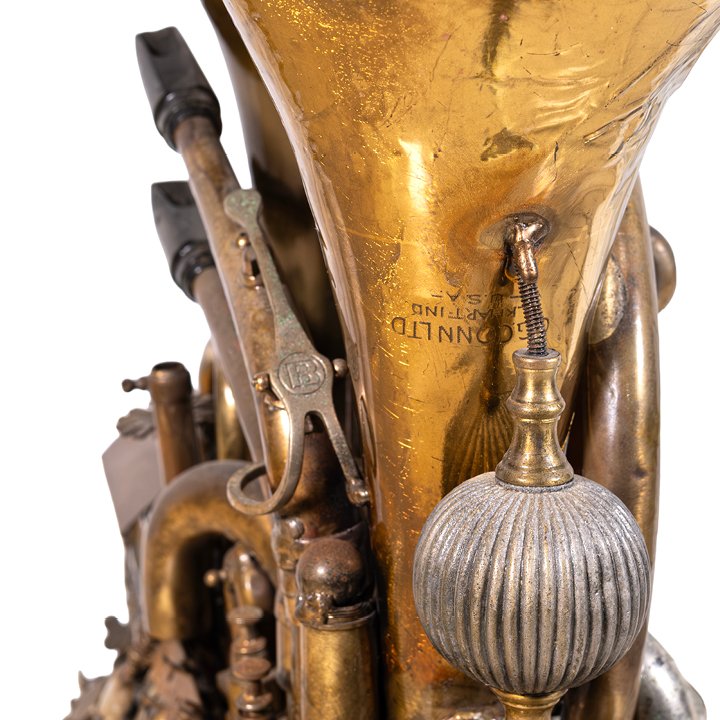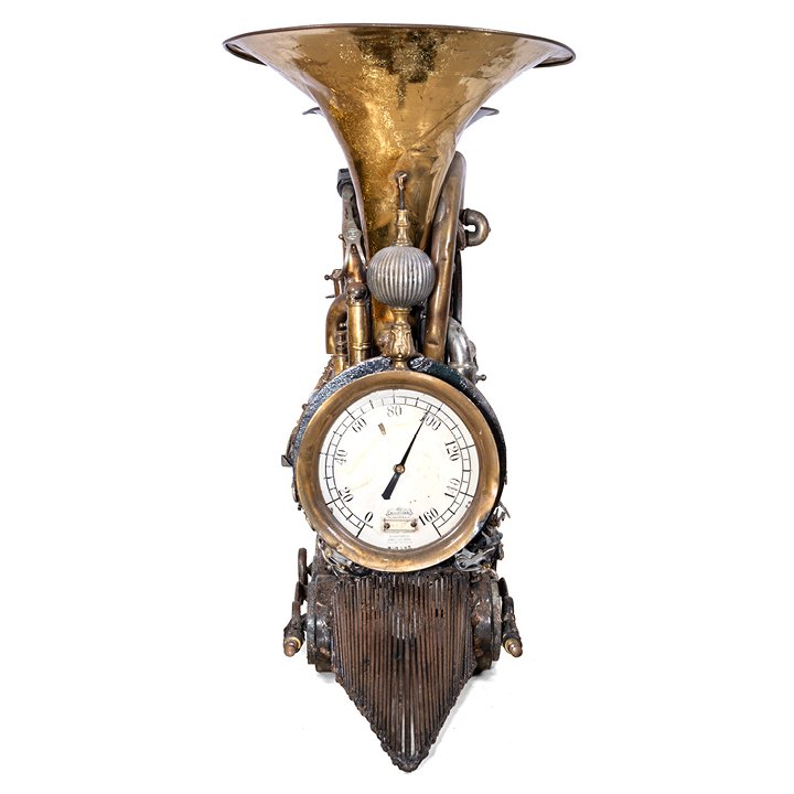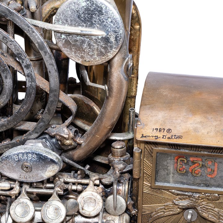 Sonny Dalton (American, 1933–2011) was a sculptor based in the United States, active from the 1960s through the 1980s. He specialized in assemblage and mixed-media constructions made from reclaimed mechanical and musical components. Dalton’s work frequently incorporated sections of brass instruments, industrial gauges, and typewriter mechanisms, reflecting the postwar American interest in found-object art. His sculptures were exhibited in regional art shows across the Midwest and are noted for their technical precision and inventive use of repurposed materials.