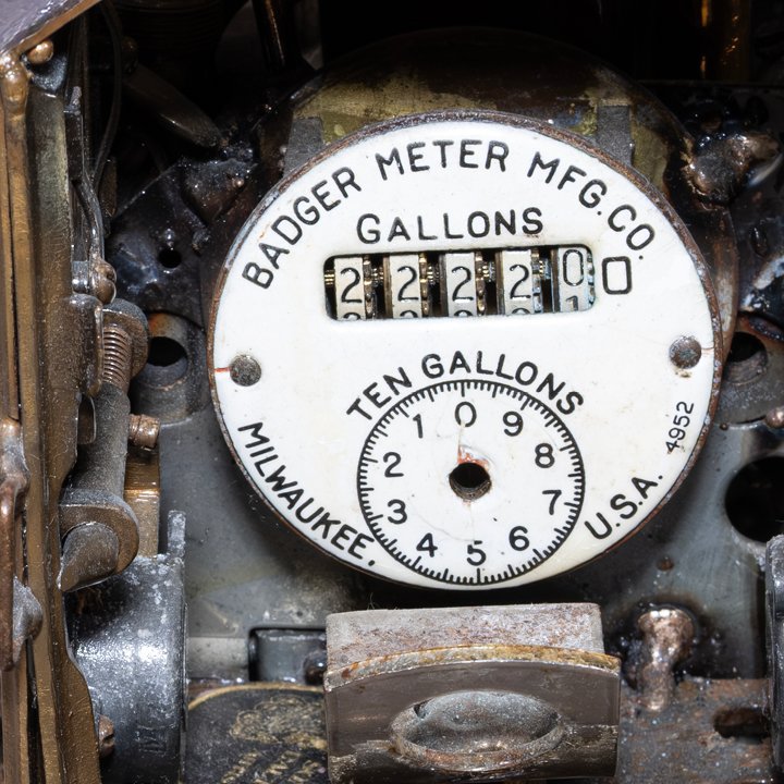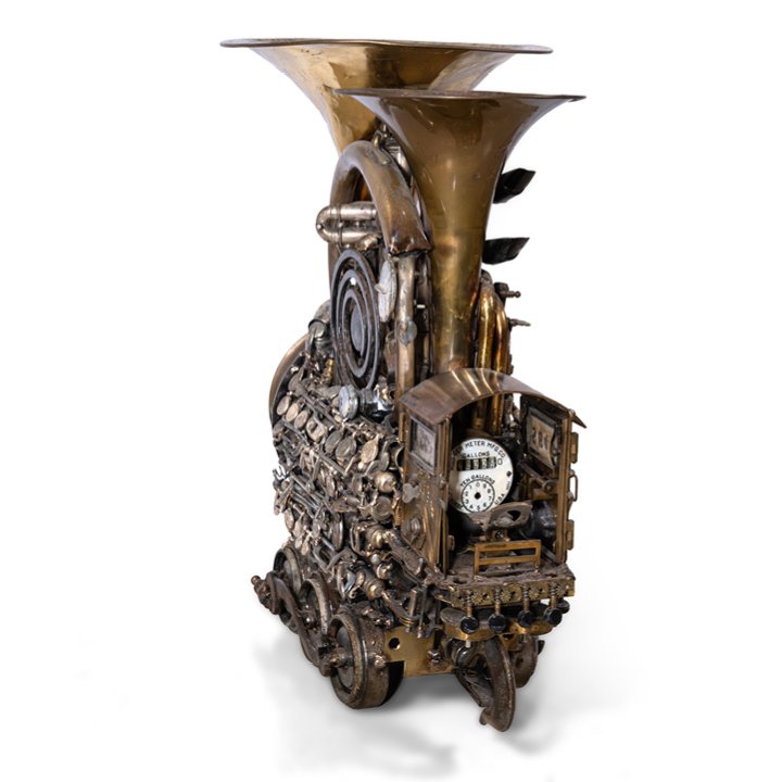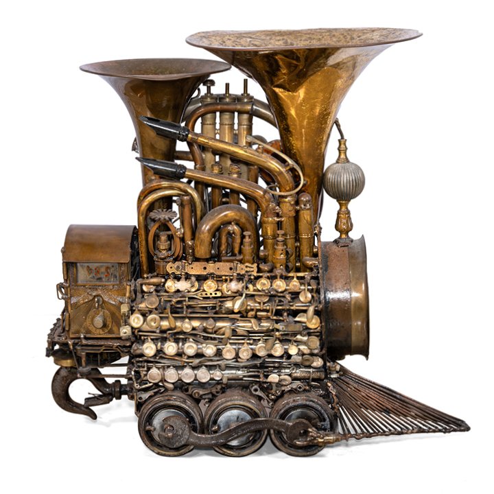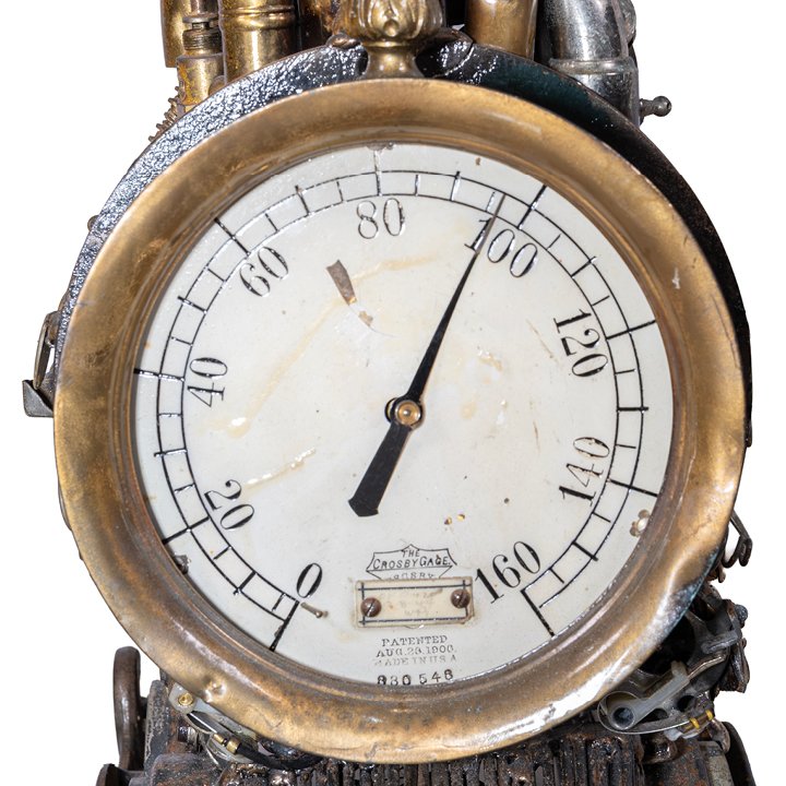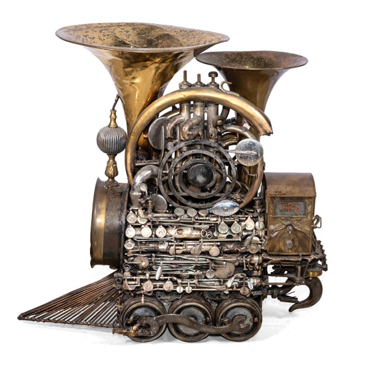 Sculptural model of a steam engine by Sonny Dalton, signed and dated 1987. The work is assembled from repurposed mixed-metal components incorporating elements of brass and woodwind instruments such as horns and valves, mounted together with industrial gauges and fittings. The frontal section features a Crosby Gage & Valve Co. pressure dial patented August 28, 1900, and a Badger Meter MFG Co. water gauge marked Milwaukee, U.S.A.. Additional recognizable fragments include brass tubing stamped Conn Ltd., Elkhart, U.S.A., sections of typewriter mechanisms, a steel wheel assembly, and a decorative clockface integrated within the engine’s front.