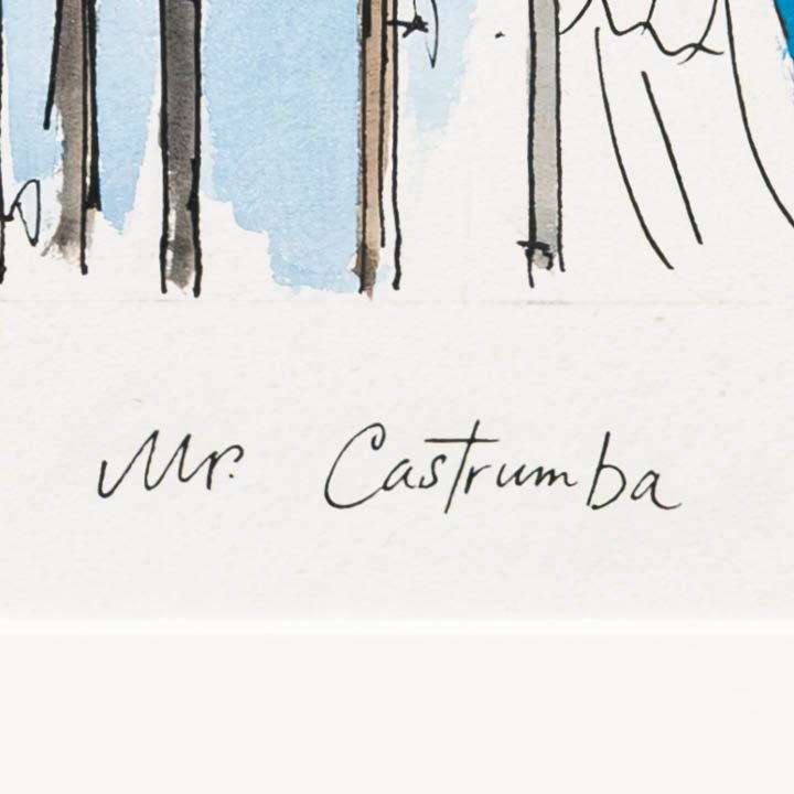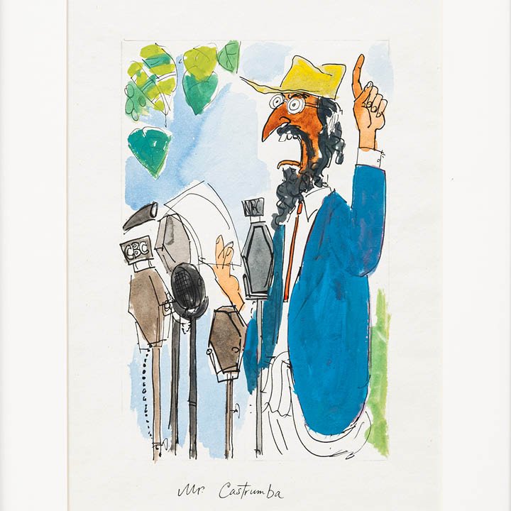 Ink and watercolour drawing by Michael ffolkes titled “Mr. Castrumba.” The work depicts a bearded speaker addressing an array of microphones, including one labelled CBC, with an outdoor backdrop of foliage and sky. The figure is titled below the image as Mr. Castrumba, a reference to Dr Abdul Ngong Castrumba, the fictional satirical character created by British columnist Peter Simple for The Daily Telegraph.