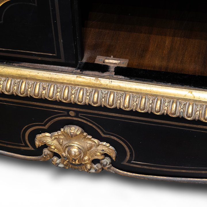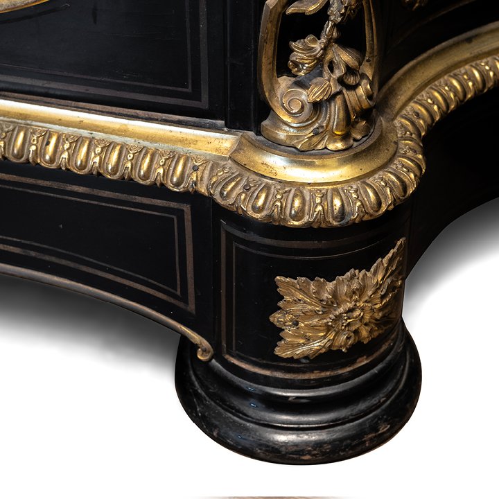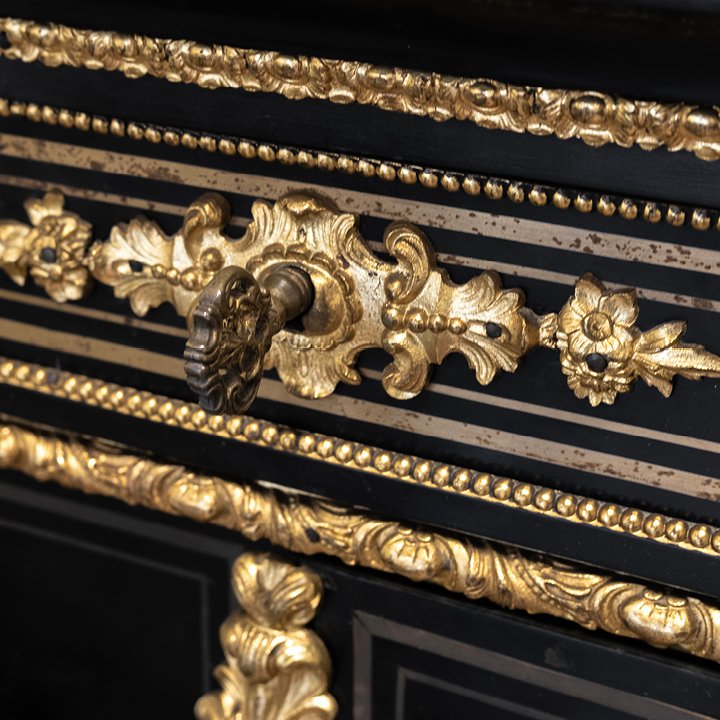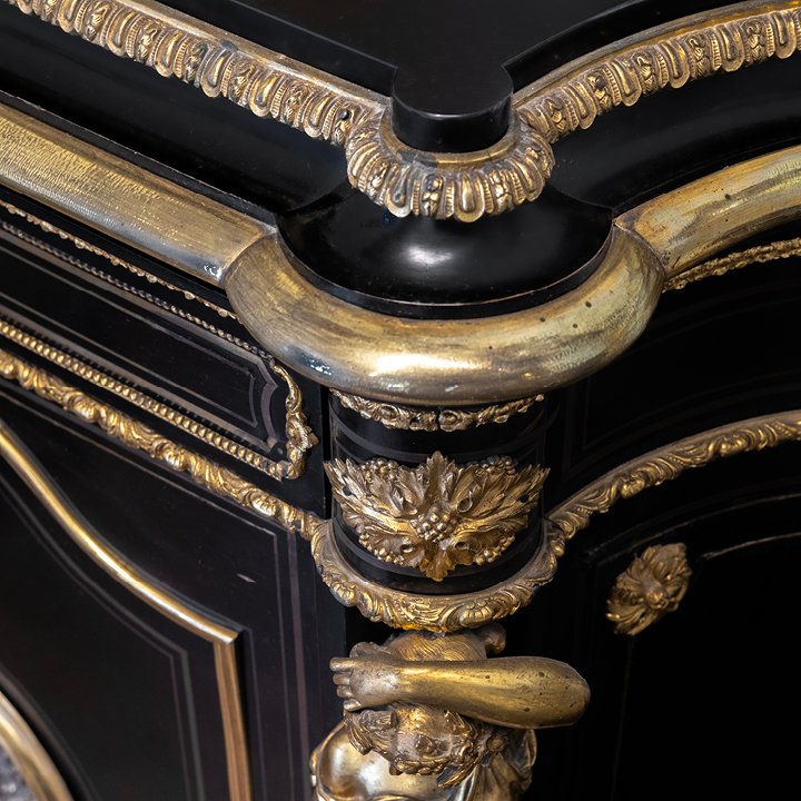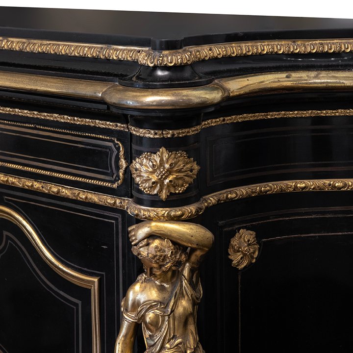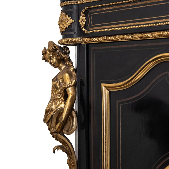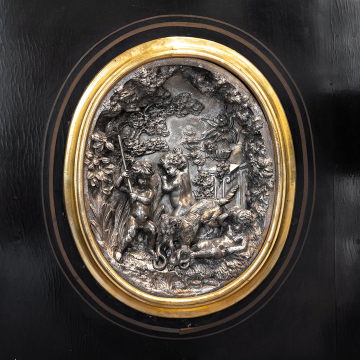 Napoleon III solid oak cabinet with ebony veneer and carved black marble top. The facade is framed with gilt bronze mounts of caryatids, and two doors are decorated with silver medallions, that depict cherubs playing in the garden. The interior is clad in varnished mahogany. A handwritten label on the back states: "1872 / M. Cottin".