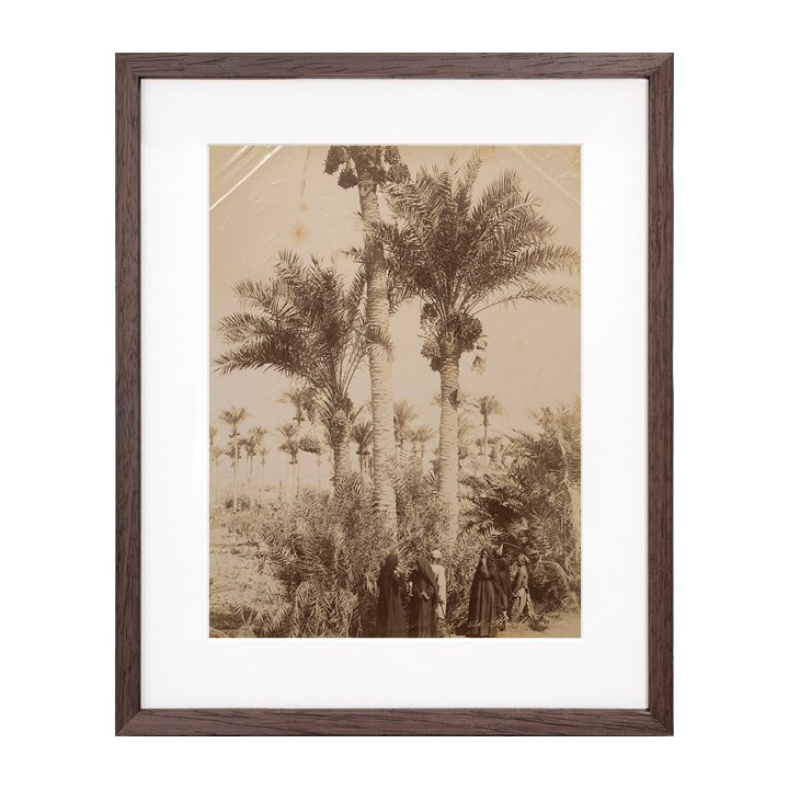 Antique albumen print reveals Egyptian rural scene harvesting dates from tall date palm trees. Numbered and titled "Nr 556 Recolte des Dattes" on the lower right and signed "Zangaki" on the lower left. Slight signs of wear and fading. Newly framed.
