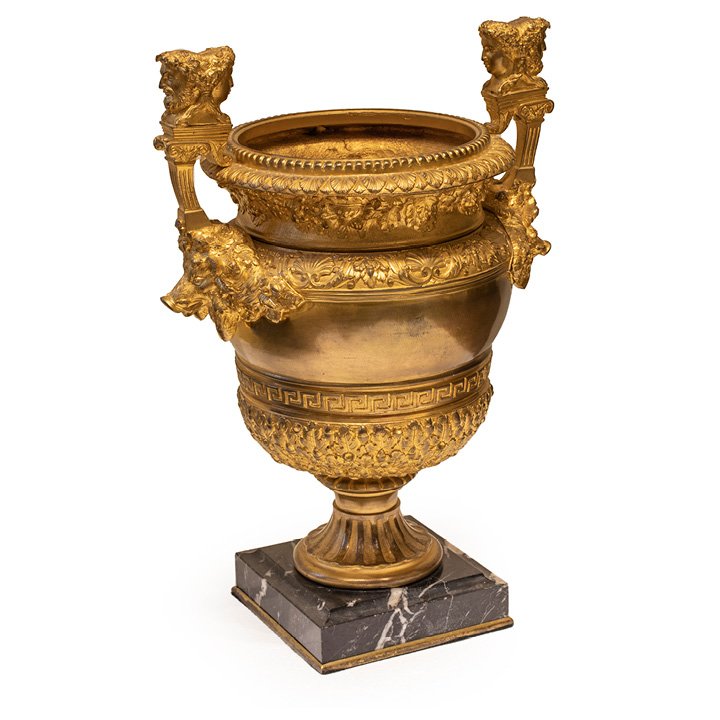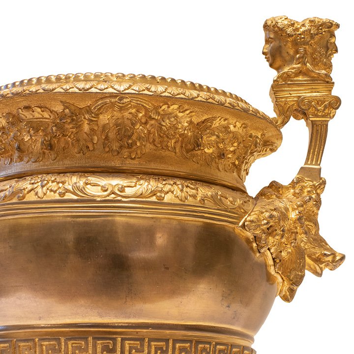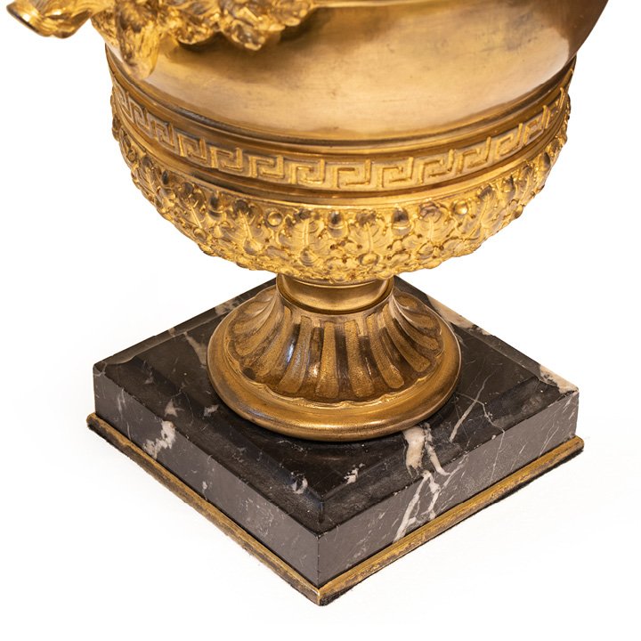 Gold vase with "Grigio Carnico" marble plinth. This vase is a copy of the original piece that, generally believed, was cast by Duval after a design by Claude Ballin, goldsmith to Louis XIV. It is one of the 13 models that separate Parterre du Nord and Parterre d'Eau in Versailles. Cast with acorns and oak leaves under a Greek Key frieze with Janus-head handles.