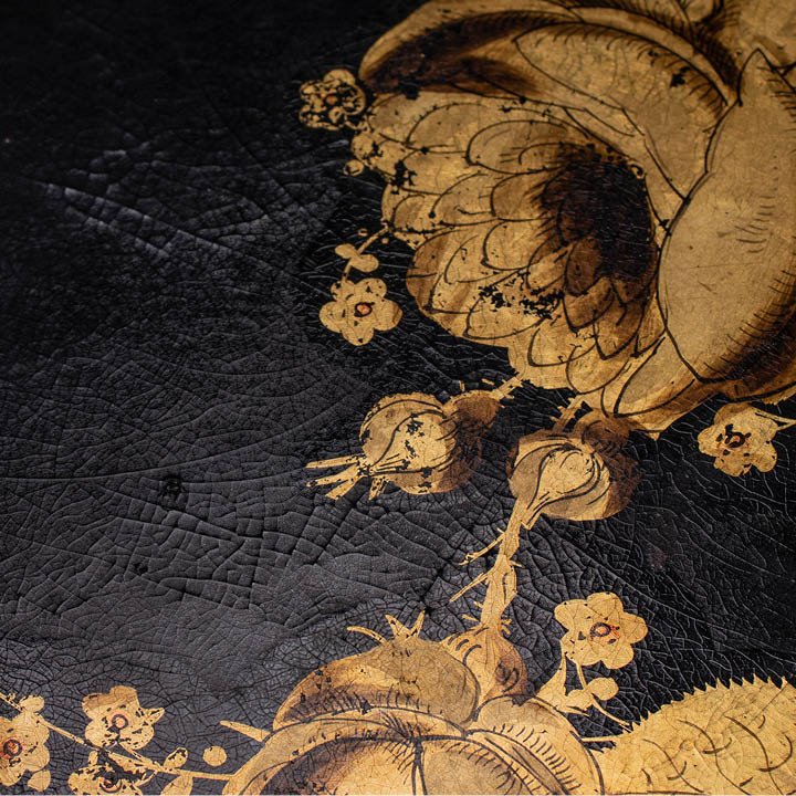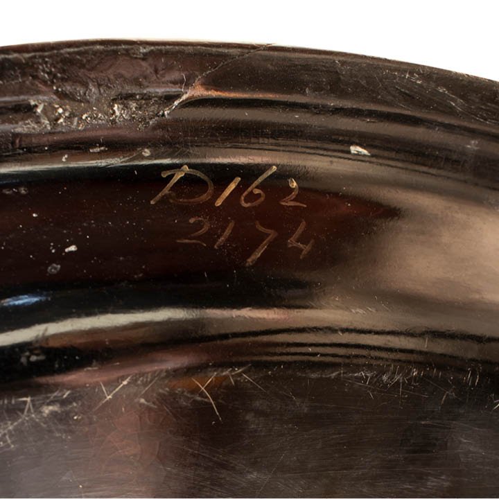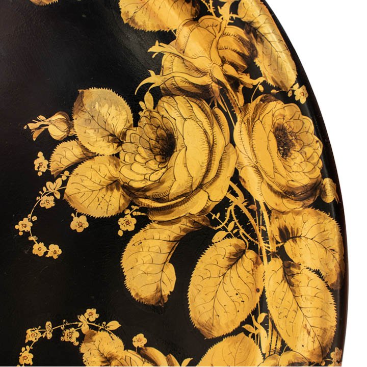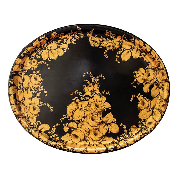 Large oval papier mache serving tray with roiled rim and gilt floral adorning. Probably mid-19th century. Signed on the verso "D162/2174". Slight wear is visible due to age.