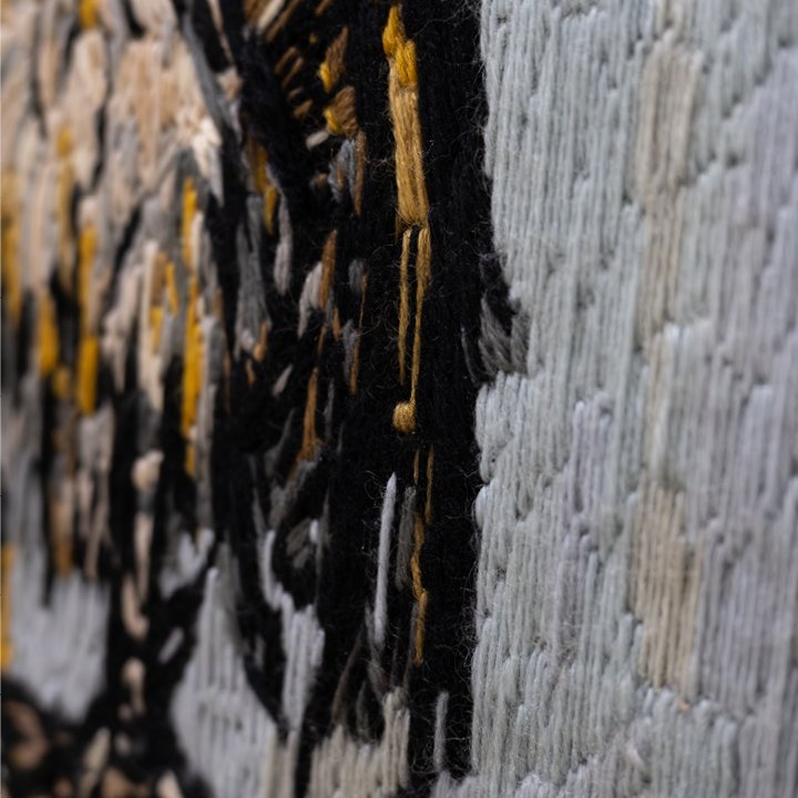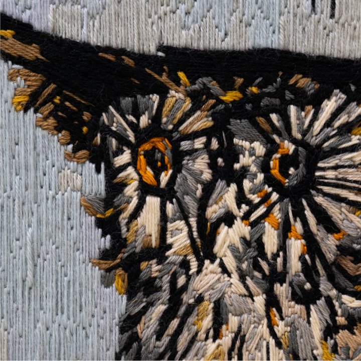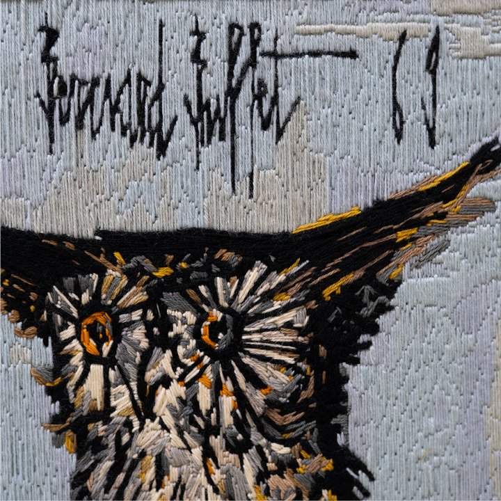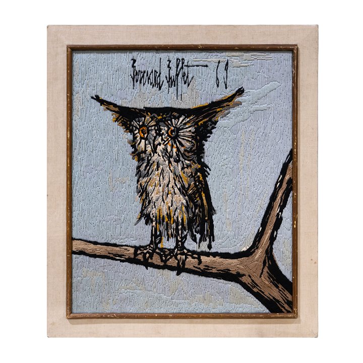 Wool tapestry after Bernard Buffet titled "La Chouette" – created in long-stitch wool on canvas after the artist’s composition, a format issued by DMC. Signed and dated Bernard Buffet 69 at the upper edge. Preserved in great condition, framed.