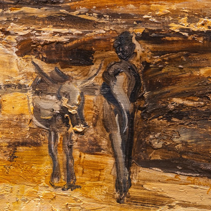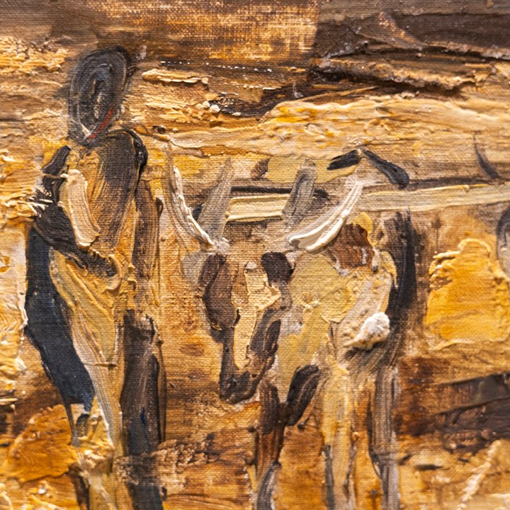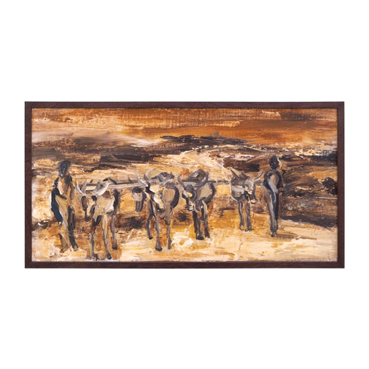"Ox and Farmers" is a figural landscape composition depicting the Motherland of South African sculptor Stella Shawzin. Signed and dated 1963 on the lower right, newly framed.