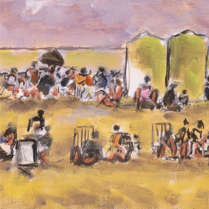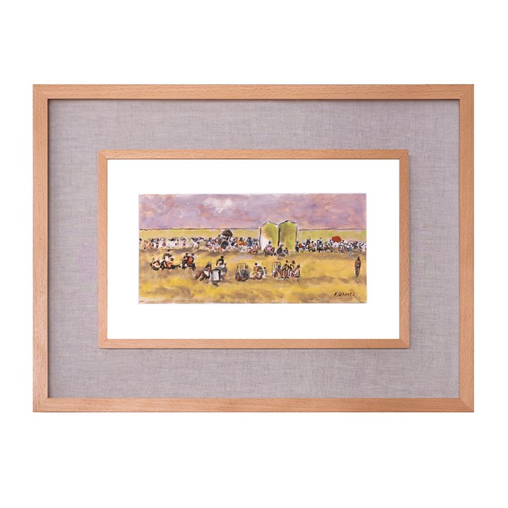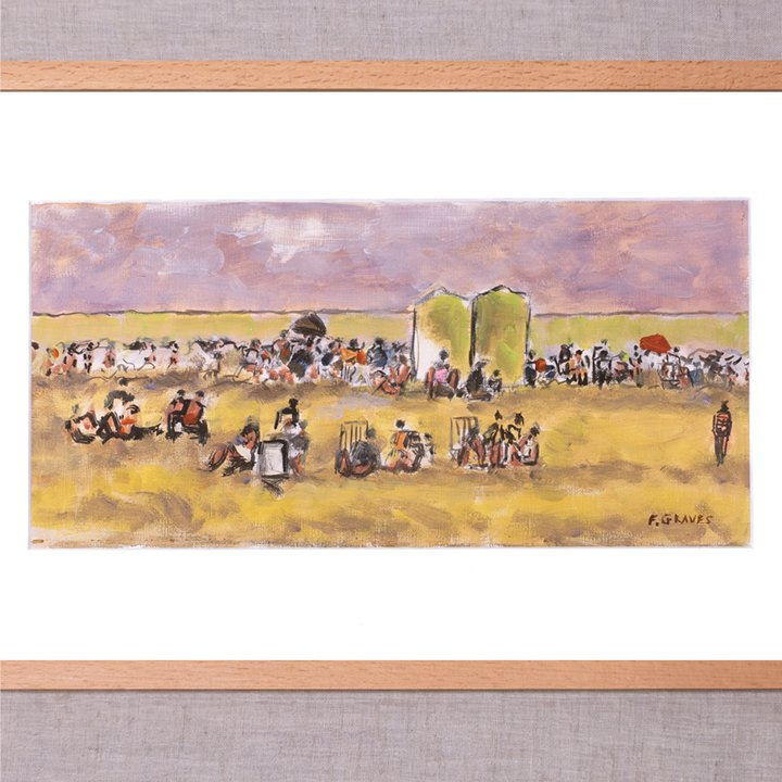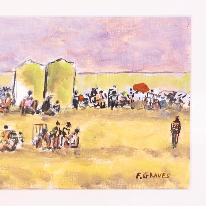 A colorful painting picturing a landscape with a crowd enjoying their afternoon outdoors, and possibly at horse race. Signed by the artist "F. Graves" on the lower right.