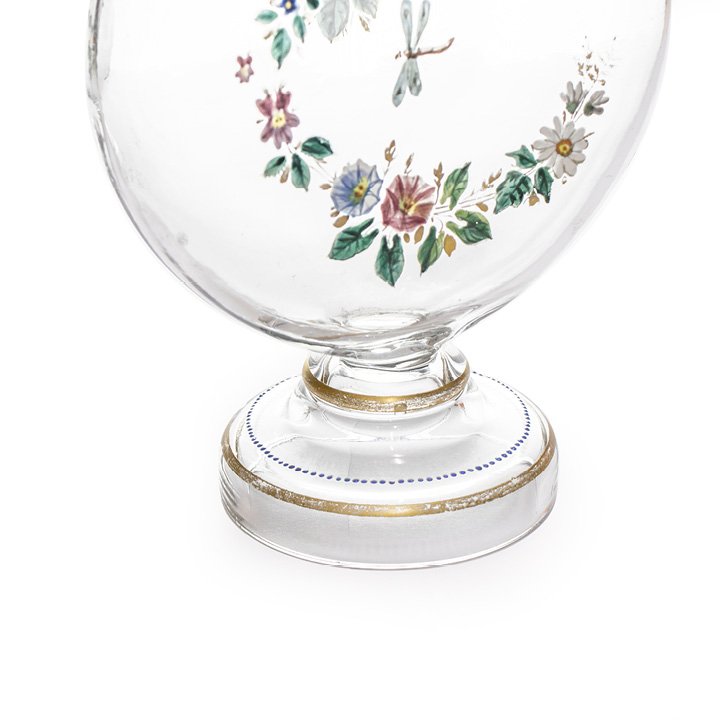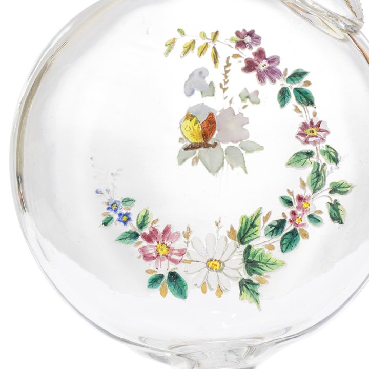 A pair of small carafes in clear glass with hand painted flowers and butterflies in the center part and some gilding. Could be used for drinks or as decorative pieces.