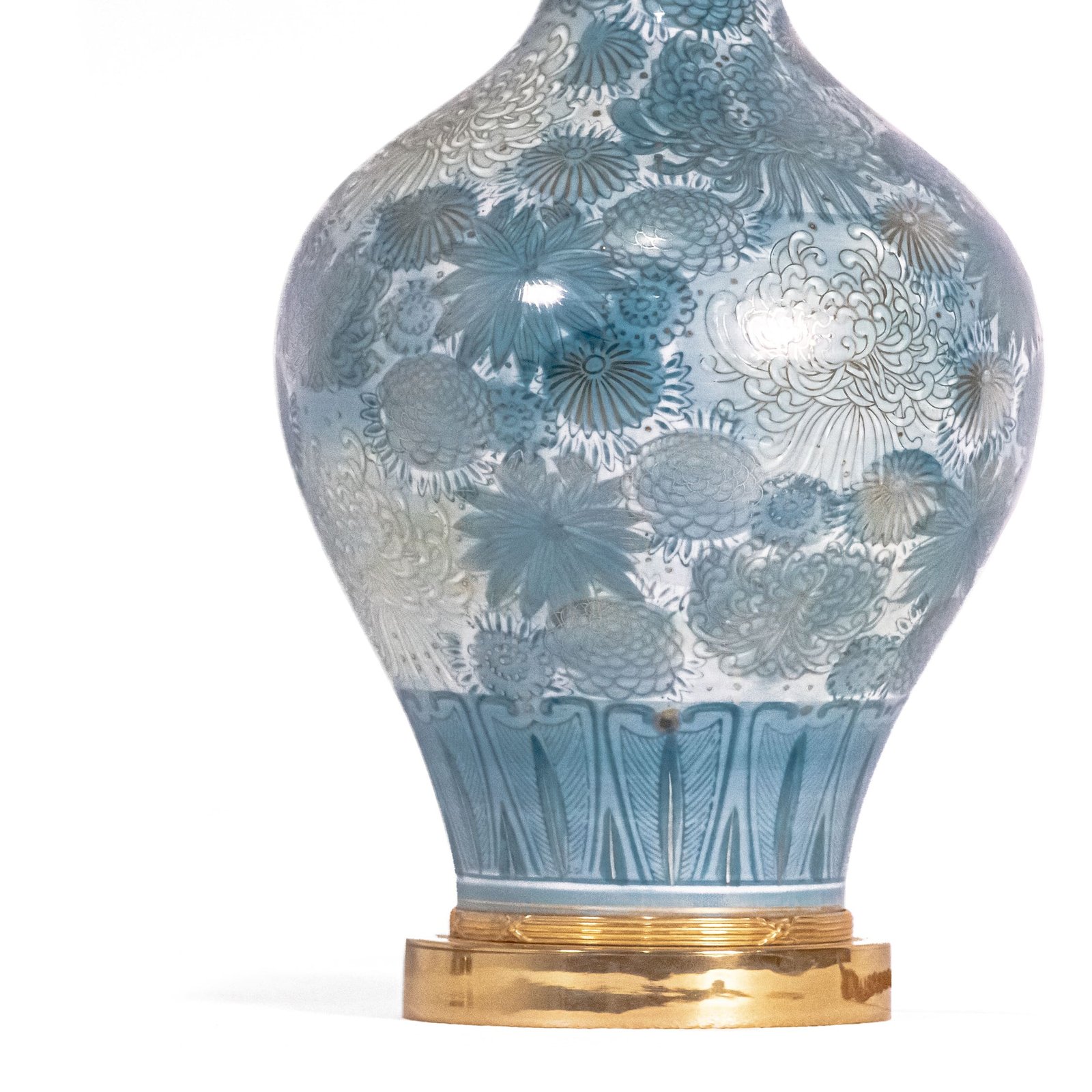 Beautiful and fine ceramic enameled table lamps, the pattern is all hand-painted with floral embellishment. The lamp is wired with a silk cable and plugged with a Type G plug. Beige linen shades are newly customized for the lamps.