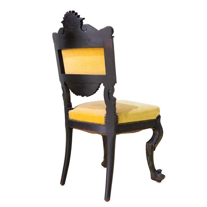 A pair of 'Egyptian Revival' Chairs. The wooden frame and legs of the chairs are black with colorful motifs and figures. The backrest and seats are upholstered with a mustard yellow velvet.