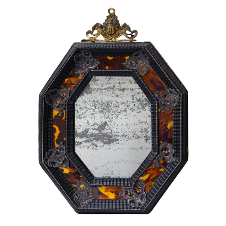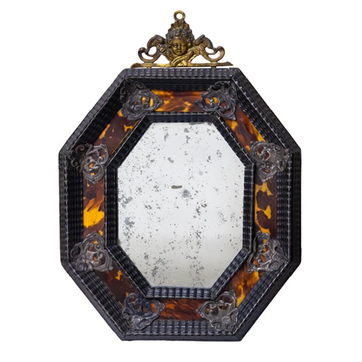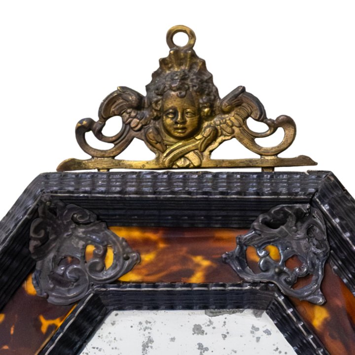 A pair of octagonal wall mirrors with faux tortoiseshell frames. Small metal design elements are attached to the frame and gilded bronze cherub heads on the top of each of the mirrors.