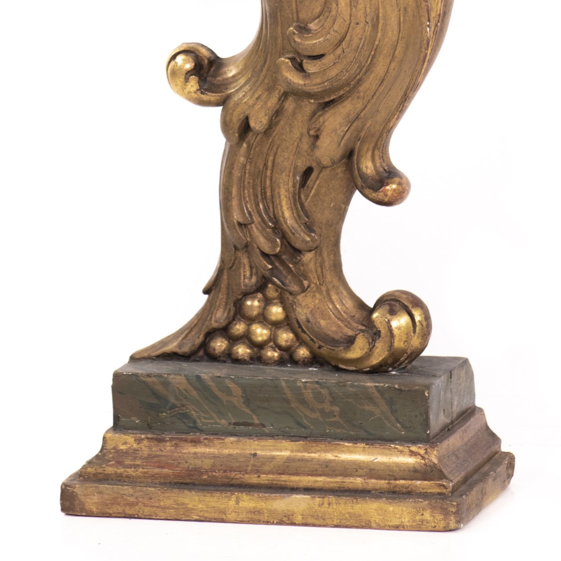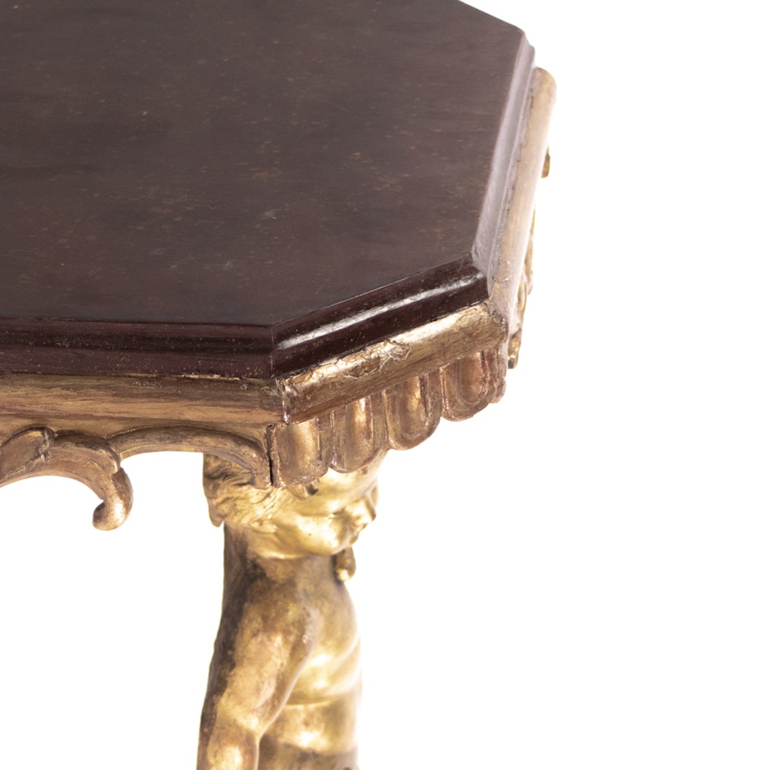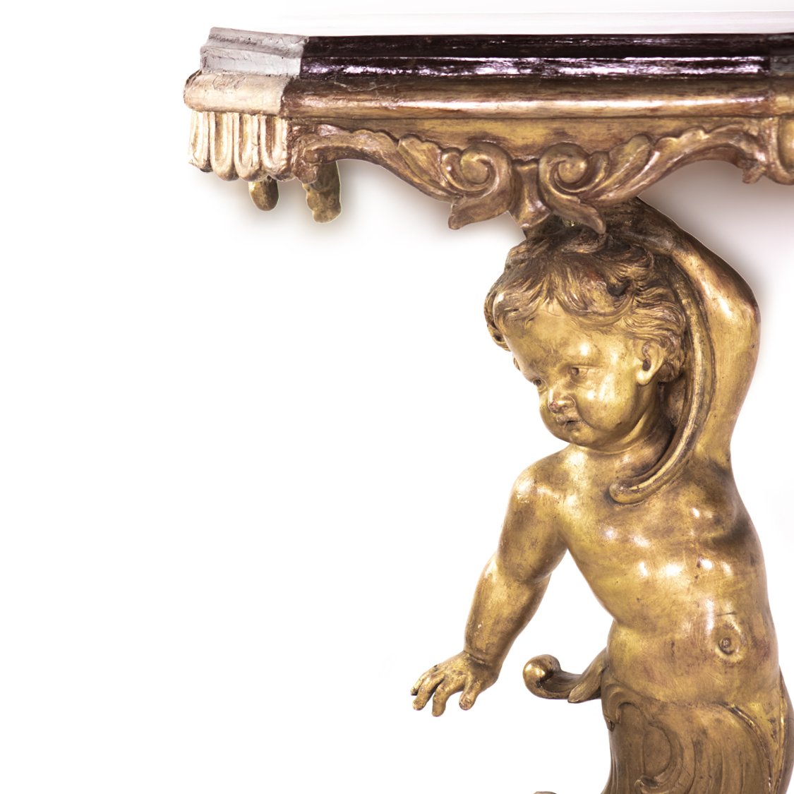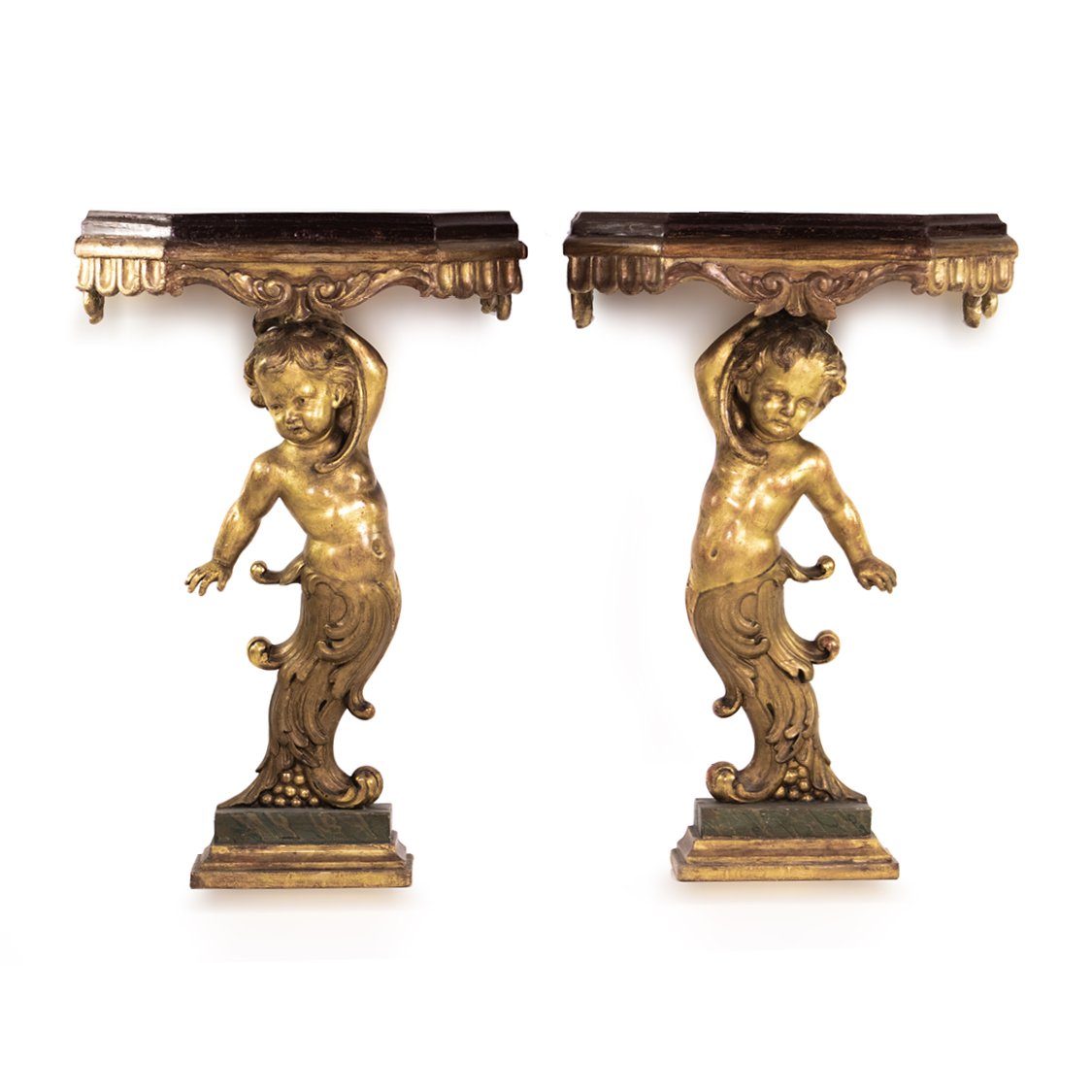 A pair of decorative hall consoles in parcel-gilt carved wood. Each Console is supported by a cherub holding up the top. Dated around the Mid 1900's. Rear hooks are attached for wall fixture. Minor retouches applied to the freeze details.