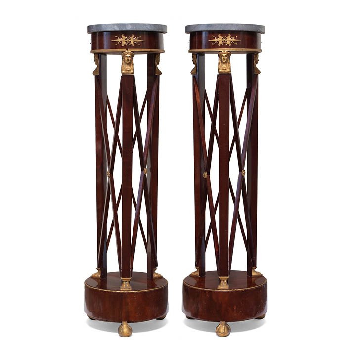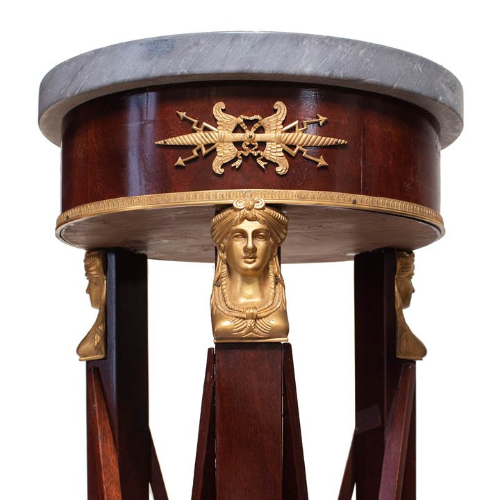 A pair of tall mahogany pedestals in Empire style. Decorated with gilt bronze mounts including Caryatids, claw feet, and cameo bolts. Completed with round grey marble tabletops. In great condition, minor retouches are made on the worn areas.