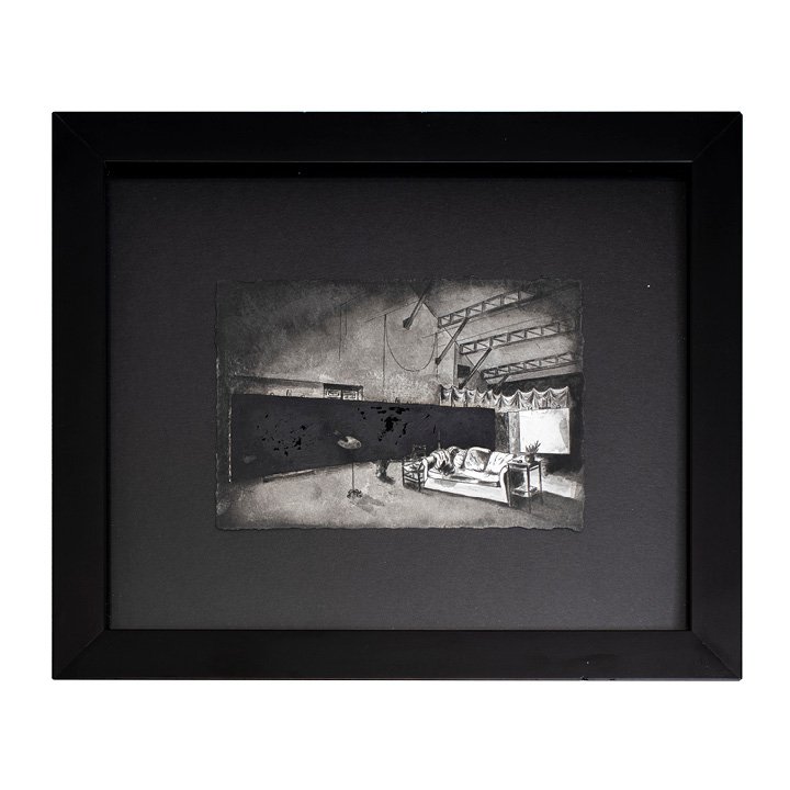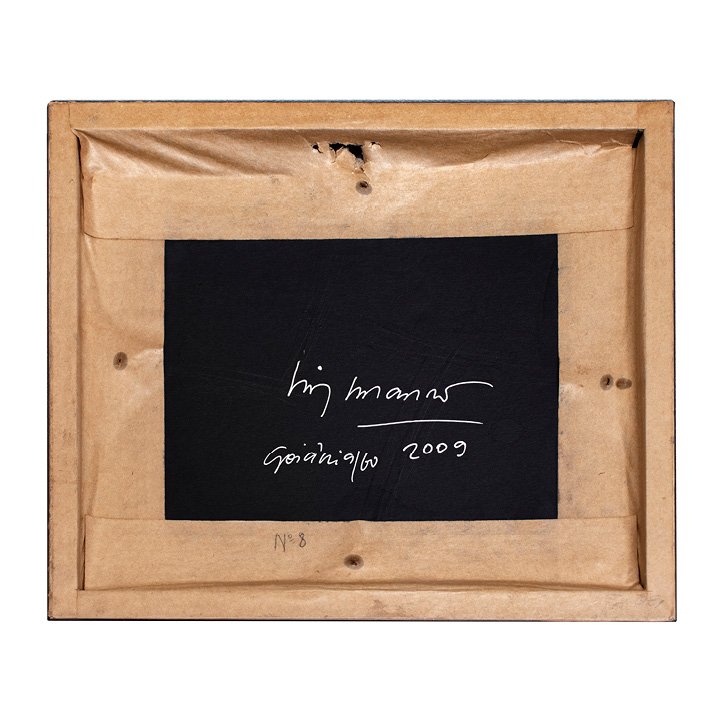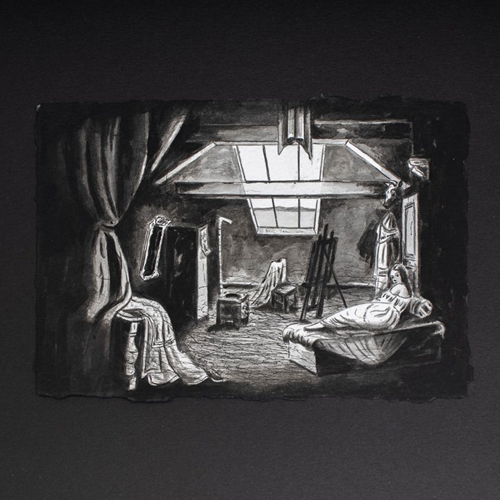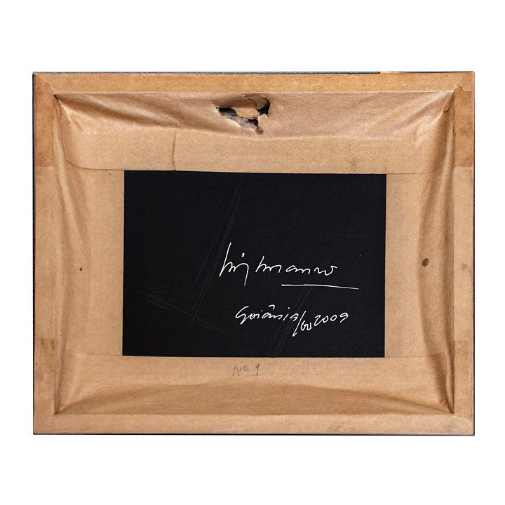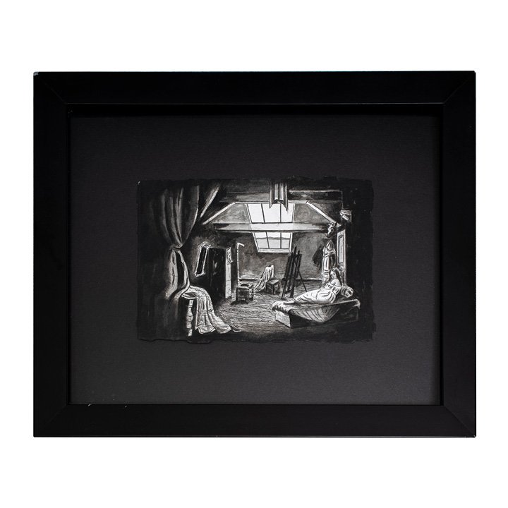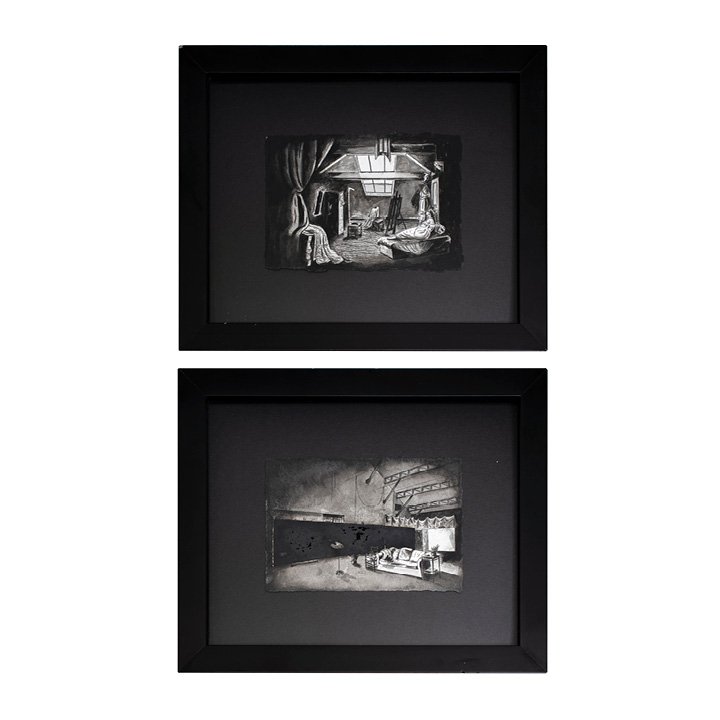 Pair on black and white mixed media on torn paper miniature paintings. The depicted scenes include artist studio with a model and loft/warehouse interior with painting equipment. Both are signed at the verso: *artist name unclear* Goiania/60, 2009.