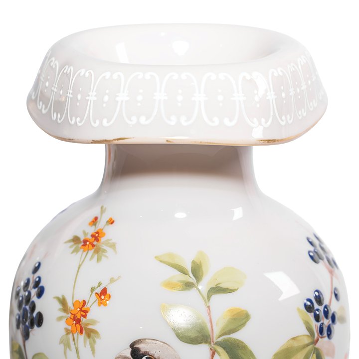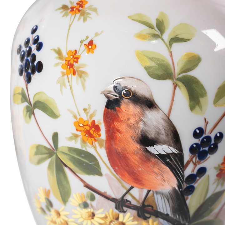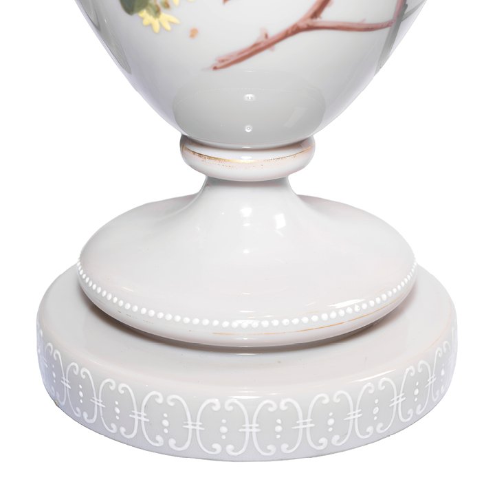 Pair of whimsical pastel-grey opaline glass vases of stemmed baluster shape with flared rims. Decorated with hand-painted enamel birds on branches on front sides and foliage on the back sides. The rims and the bases are adorned with Aesthetical style pattern in white, partially gilt. Preserved in great antique condition.