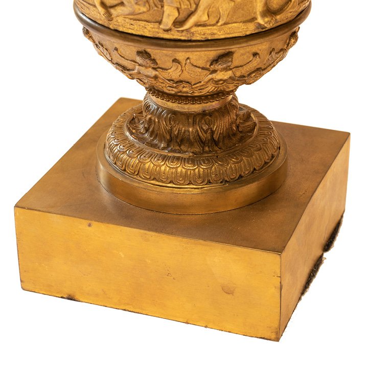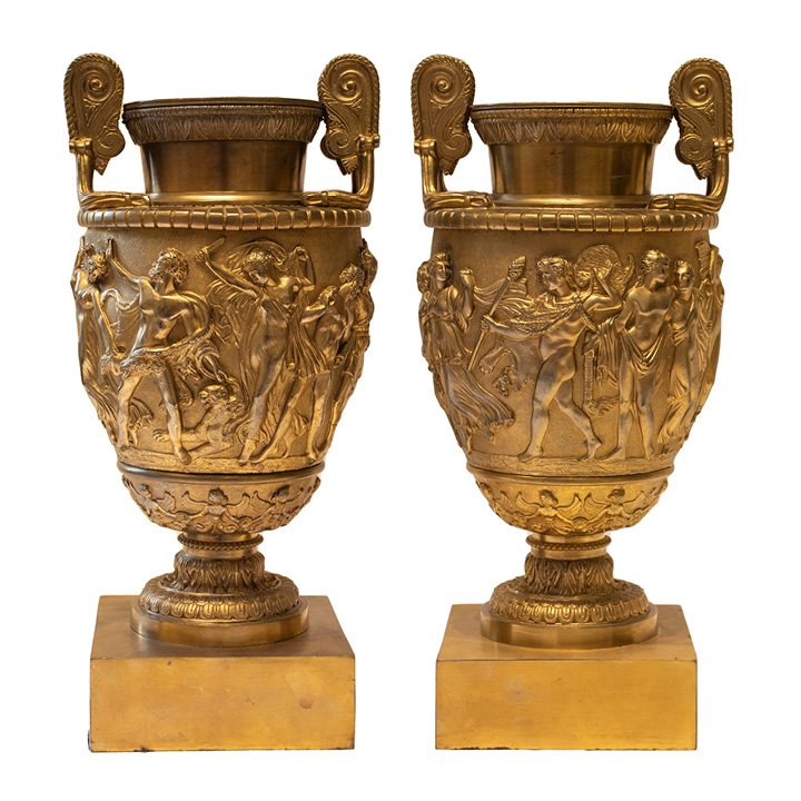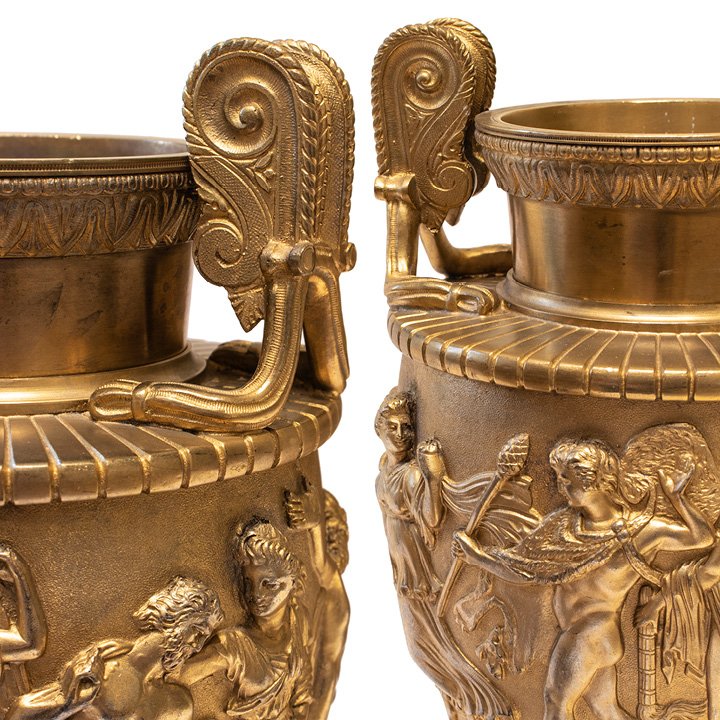 Pair of French Neo-Classical ormolu urns with two handles on each and square bases. Decorated with high relief with figures Baccus, Pan, and other characters at the celebration.