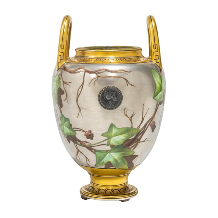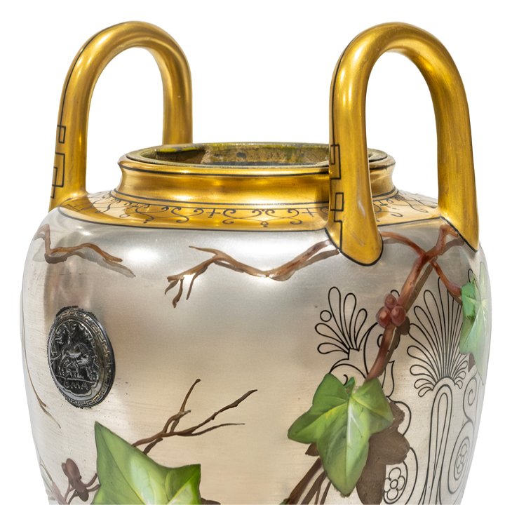 A pair of porcelain vases in the form of a kalpis or stamnos, with upright loop handles and a rounded shoulder tapering to a narrow foot. The surface is covered in a matte platinum ground, hand-painted with ivy vines in naturalistic shades of green and brown. Each side features an applied classical-style medallion, and the rim and foot are enriched with gilded Greek key and scrollwork borders. Signed N. Vivien on the underside.