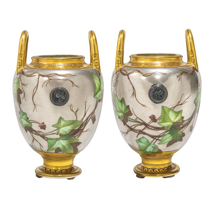 Pair of Porcelain Vases with Ivy Decor on Platinum Ground